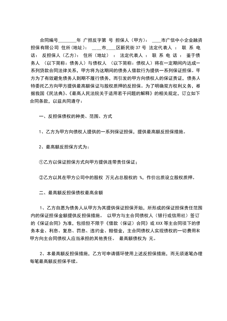 合同编号________年 广担反字第 号 担保人(甲方): ____市广信中小企业融资担保有限公司 住所(地址): ____市____区新民街37号 法定代表人 : 联 系 电 话 : 反担保人(乙方): 住所(地址) : 法定代表人 : 联 系 电 话 : 鉴于债务人 (以下简称:债务人)与债权人 (以下简称:债权人)将在一定期间内达成一系列贷款合同法律关系,甲方将为这期间的债务人借款行为提供一系列保证担保。甲方为了有效避免债务人到期不履行债务,而引发的甲方向债权人的保证责证,债务人特委托乙方向甲方提供最高额保证与股权质押的反担保。为了明确双方权利义务,根据我国《民法典》、《最高人民法院关于适用若干问题的解释》的相关规定,订立如下合同条款,以兹共同遵守: