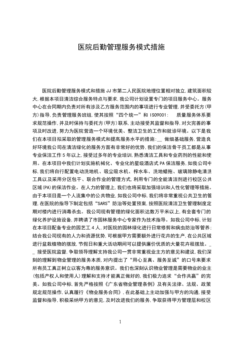 医院后勤管理服务模式和措施JJ市第二人民医院地理位置相对独立,建筑面积较大,根据本项目清洁综合服务特点与要求,我公司计划设置专门的项目服务中心。服务中心在合同期内负责对所有涉及乙方服务范围内的事项进行专业管理,并受委托方(甲方)指导,负责管理服务班组,使其按照“四个统一”和ISO9001: 质量服务体系要求规范操作,并及时保持与委托方(甲方)联系,主动接受其监督和指导,对欠完善的事项及时改进,努力为医院营造一个环境优美、整洁卫生的工作和就诊环境。以下是我们在本项目拟采取的管理服务模式和提高服务水平的措施:__ 做细基础服务,营造良好环境我公司在清洁绿化的服务方面有非常好的优势,我们的保洁骨干员工都是从事专业保洁工作5年以上,接受过多年的专业培训,熟悉清洁工具和专业药剂的性能和使用。在本项目中我们计划实施机械化、专业化的星级酒店式PA保洁服务,如我公司中标,我们将自行配置电动洗地机、吸尘吸水机、榨水车、洗地蜡拖、玻璃除静电清洗工具以及采用分区包干、联合作业的管理方式,利用专门的全能清洁剂进行校区公共区域(PA)的保洁作业。在人力的管理上,我们也将采取加强培训和人性化管理等措施。由于本项目是一个人流集中的公共物业,如我公司中标,我们将非常重视公共卫生的管理,在医院的指导下制定包括“SARS”防治等处置预案,按照医院清洁卫生管理制度定期对楼内进行消毒杀虫。我公司现有管理的绿化面积达数万平米以上,有全套专门的绿化养护设施设备,并聘请了市园林服务中心专家作为技术指导。如我公司中标,计划在本项目配备专业的园艺工4人,对医院的园林绿化进行日常修剪和病虫防治等管养;结合我公司现有的人力和资源优势,可根据甲方需要额外进行花卉的生产,在公共区域进行盆栽植物的摆放,节假日和重大活动期间可以提供廉价优质的大量花卉租摆放。__ 接受医院监督,争取领导理解支持我公司一贯非常重视业主方的意见和建议,我们深刻的理解到物业管理的服务本质,对内提出了“用心至真、服务至诚”的口号来要求所有员工真正树立以客为尊的服务意识。我们也深刻认识物业管理是需要物业的业主(包括产权人和使用人)理解和支持才能真正做好的,我们极力追求“合作共赢”的完美。如我公司中标,首先严格按照《广东省物业管理条例》及有关法律、法规、政策规定规范操作,认真履行《物业服务合同》,在此基础上主动加强与甲方的沟通,接受监督和指导,积极采纳甲方的意见,及时改进我们的服务,争取获得甲方管理层和校区教职员工、学生的广泛满意和理解支持。我们承诺每周定期提交工作总结与计划,按照甲方的需求主动向甲方汇报工作,设置和公布公司服务品质投诉电话、电子邮件、网站等,对甲方和物业使用人的投诉限时整改,并做到回访率100%。__ 实施规范管理,保证服务品质如我公司中标,我们按照一贯的严谨管理风格,将根据项目实际情况,参照ISO9000质量管理体系标准制订整套的质量管理手册、标准作业程序、工作指导手册以及支持性表单,全面建立过程化品质监管考核体系。目前我们已经在所管项目实践这一管理思路,并已从中得到良好的效益,由于管理规范、落实到位,我们管理的项目无一例重大客诉或被盗等安全事故发生,亦欢迎甲方随时进行考察指导。在服务标准上,按照星级酒店管理及服务模式执行:所有工作人员统一着装,微笑服务,严格遵守作业流程确保服务标准化和规范化;在具体的操作上,为体现酒店式服务的规范和温馨,让本项目成为我公司物业管理服务的亮点,我们将在服装式样、服务流程设计等方面进行特色创新,如安全护卫人员我们就要求服装上不是生硬的制服而既显职业标志又能体现柔和风格,在提供安全防范巡逻和停车引导服务的同时还充当咨询解答和引导服务员,主动为前来访问者带路等等。由于本项目是医院,我们将根据实际需求要求来分配安排任务,严格遵守作业流程确保服务标准化和规范化,贯彻我公司服务到最小细节的管理理念,从人、工具等硬件和培训、品质管理等软件两个方面入手,确保服务标准得到真正的落实和体现。__ 导入适用和完善的质量管理体系我公司于成立之初就建立了公司自己的质量保证体系,通过在所管理服务的项目实际运作和持续改进,质量保证体系已日趋完善和稳定,并具有较强的可操作性。质量保证体系已成为我们提供规范化、标准化物业管理服务的基石。在JJ市第二人民医院清洁综合服务的实施过程中,我们将一如既往地推行全员质量管理,并根据医院项目的实际情况和特色制定适用的品质控制方案,在日常管理服务中加以完善,并不断摸索,使医院的物业管理不断朝着专业化、规范化、标准化、人性化的方面发展。__ 实施“质量、成本双否决”的运作机制物业管理是市场活动,物业管理公司受用户委托提供用户所需要的管理服务,作为企业物业管理公司是必须有盈利能力的,没有收支平衡控制能力的管理和服务无论对企业还是用户来说都肯定不是好事情。从物业管理行业的特点来看,节约和控制成本对企业来说是必然的,低廉的服务价格对用户来说也是有利的;但是,我们清楚的看到,控制成本与保证质量不应该是矛盾的,以牺牲质量为基础的成本控制不是解决问题的根本办法,惟有