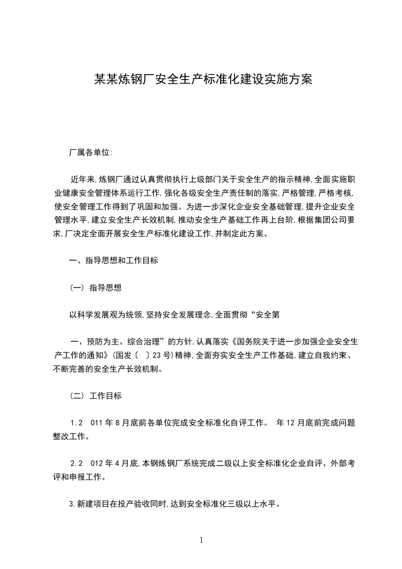 近年来,炼钢厂通过认真贯彻执行上级部门关于安全生产的指示精神,全面实施职业健康安全管理体系运行工作,强化各级安全生产责任制的落实,严格管理,严格考核,使安全管理工作得到了巩固和加强。为进一步深化企业安全基础管理,提升企业安全管理水平,建立安全生产长效机制,推动安全生产基础工作再上台阶,根据集团公司要求,厂决定全面开展安全生产标准化建设工作,并制定此方案。