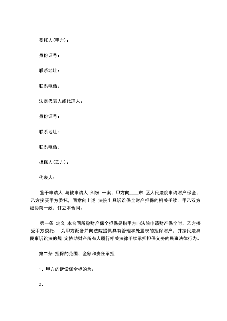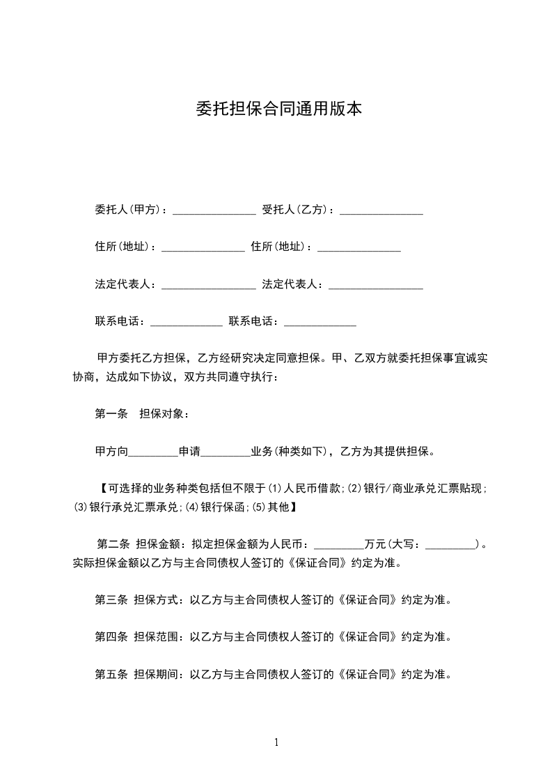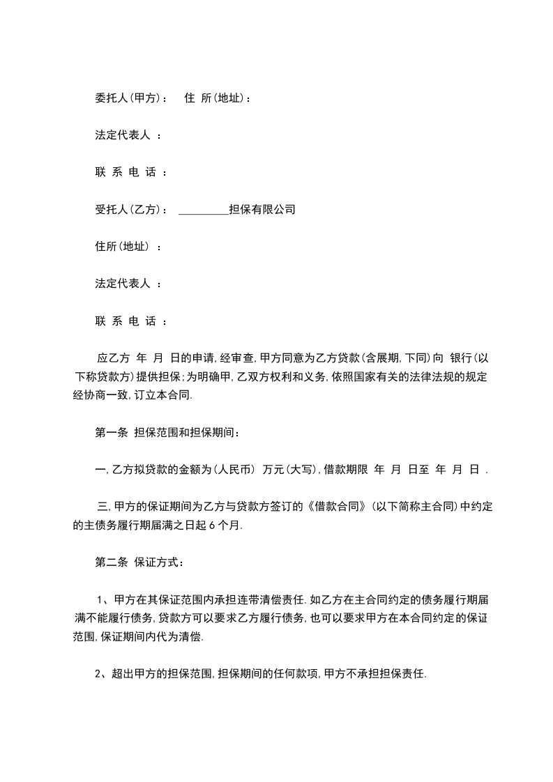 委托人(甲方): 住 所(地址): 法定代表人 : 联 系 电 话 : 受托人(乙方): 担保有限公司 住所(地址) : 法定代表人 : 联 系 电 话 : 应乙方________年____月____日的申请,经审查,甲方同意为乙方贷款(含展期,下同)向 银行(以下称贷款方)提供担保;为明确甲,乙双方权利和义务,依照国家有关的法律法规的规定,经协商一致,订立本合同。