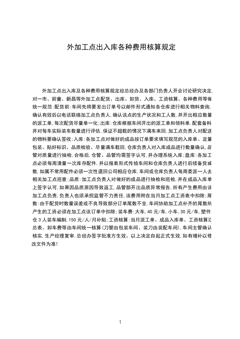 外加工点出入库及各种费用核算规定经总经办及各部门负责人开会讨论研究决定,对一市、前童、新昌等外加工点配货、出库、卸货、入库、工资核算、各种费用等做统一规范:配货前:车间先将要发出订单号以邮件形式通知各仓库进行相关物料查询,确认有效后以电话联络加工点负责人,确认该点的生产状况和工人数,并开出相应数量的派工单,每次配货尽量单一化;出库:仓库根据车间开出的派工单和领料单,配套备料,并对每车实际装车数量进行评估,保证不超载的情况下满车来回,加工点负责人对配送的物料要确认签收;入库:各加工点对做好的成品按订单要求填写规范的入库单、定量包装、贴好标识、品质检验、尽量满车载回,仓库负责人对入库成品进行数量确认,品管对质量进行抽检,合格后,仓管、品管均需签字认可,并办理系统入库;盘库:各加工点必须每周清量一次库存配件,并以报表形式传给车间和仓库负责人进行后续备货减数,如属不常用配件必须一次性退回公司相应仓库,车间或仓库负责人每周委派一人去相关加工点巡查;品质:加工点负责人对做好的成品进行抽检和巡检,并在成品入库单上签字认可,如果因品质原因导致返工,品管部开出品质异常报告,所有产生费用由该加工点负责,负责人也须承担监管不力责任,该费用附在当月加工点工资表中扣除;尾数:由于配货时数量误差或不良导致部分订单尾数不全,车间协助加工点补齐的尾数所产生的工资必须在加工点该订单中扣除;装车费:大车,40元/车,小车,30元/车,塑件仓3人装车编制,150元/人/月补贴;工资核算:当月派工单、成品入库单、工资核算汇总表、卸车费等由车间统一核算(刀管由包装车间、装刀由装配车间),车间主管确认核实,生产经理复审,总经办签字批准方生效。以上决定自起正式生效,如有增补以修改文件为准!