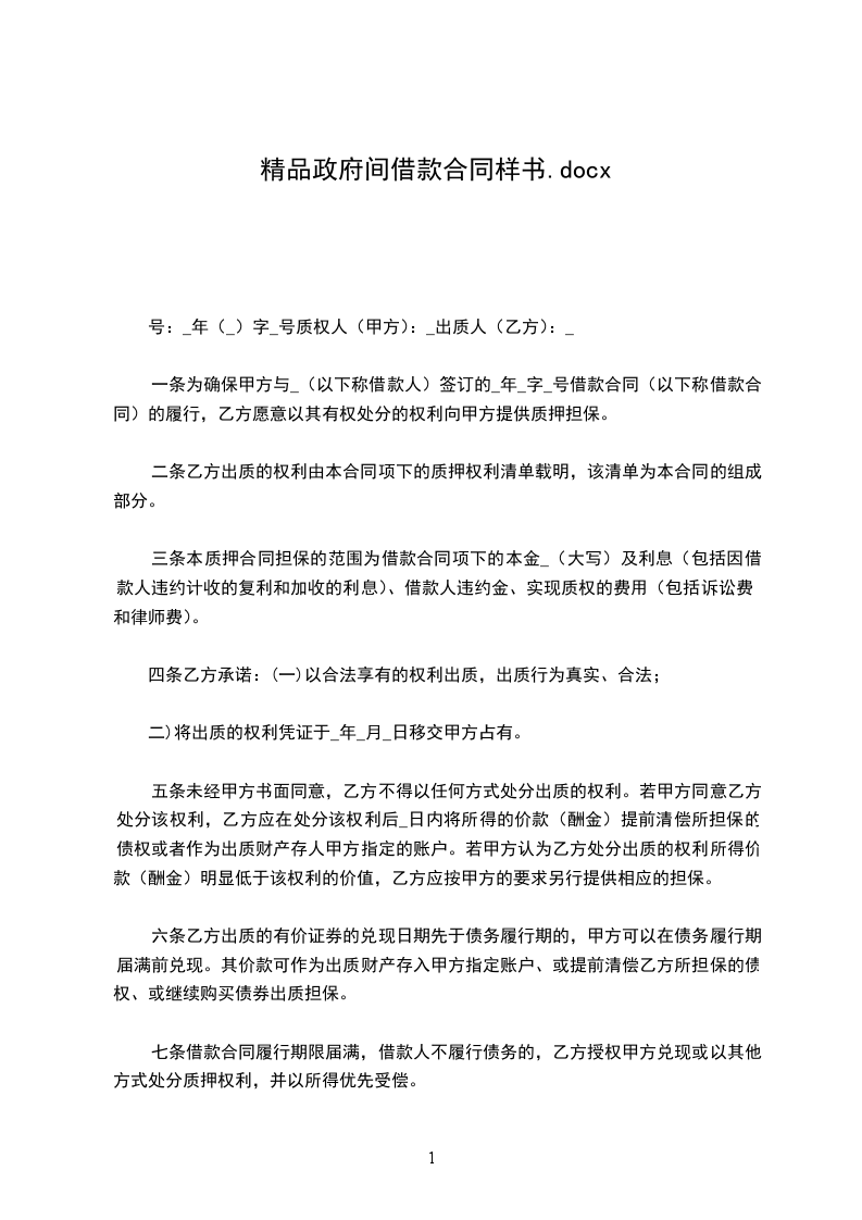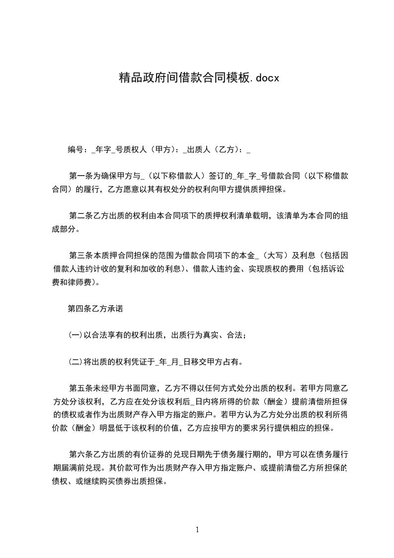 第一条 为确保甲方与_________(以下称借款人)签订的________年_________字_________号借款合同(以下称借款合同)的履行,乙方愿意以其有权处分的权利向甲方提供质押担保。