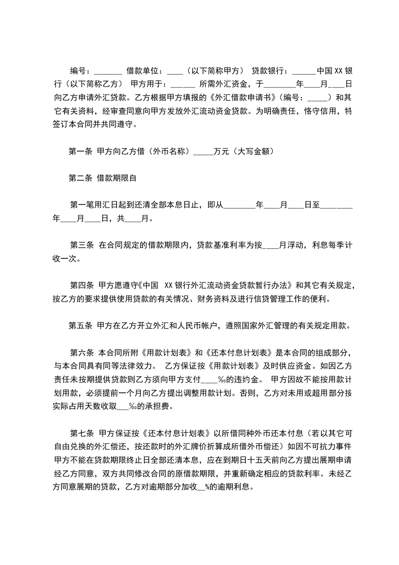 编号:_______ 借款单位:____(以下简称甲方) 贷款银行:______中国XX银行(以下简称乙方) 甲方用于:______ 所需外汇资金,于________年____月____日向乙方申请外汇贷款。乙方根据甲方填报的《外汇借款申请书》(编号:_____)和其它有关资料,经审查同意向甲方发放外汇流动资金贷款。为明确责任,恪守信用,特签订本合同并共同遵守。