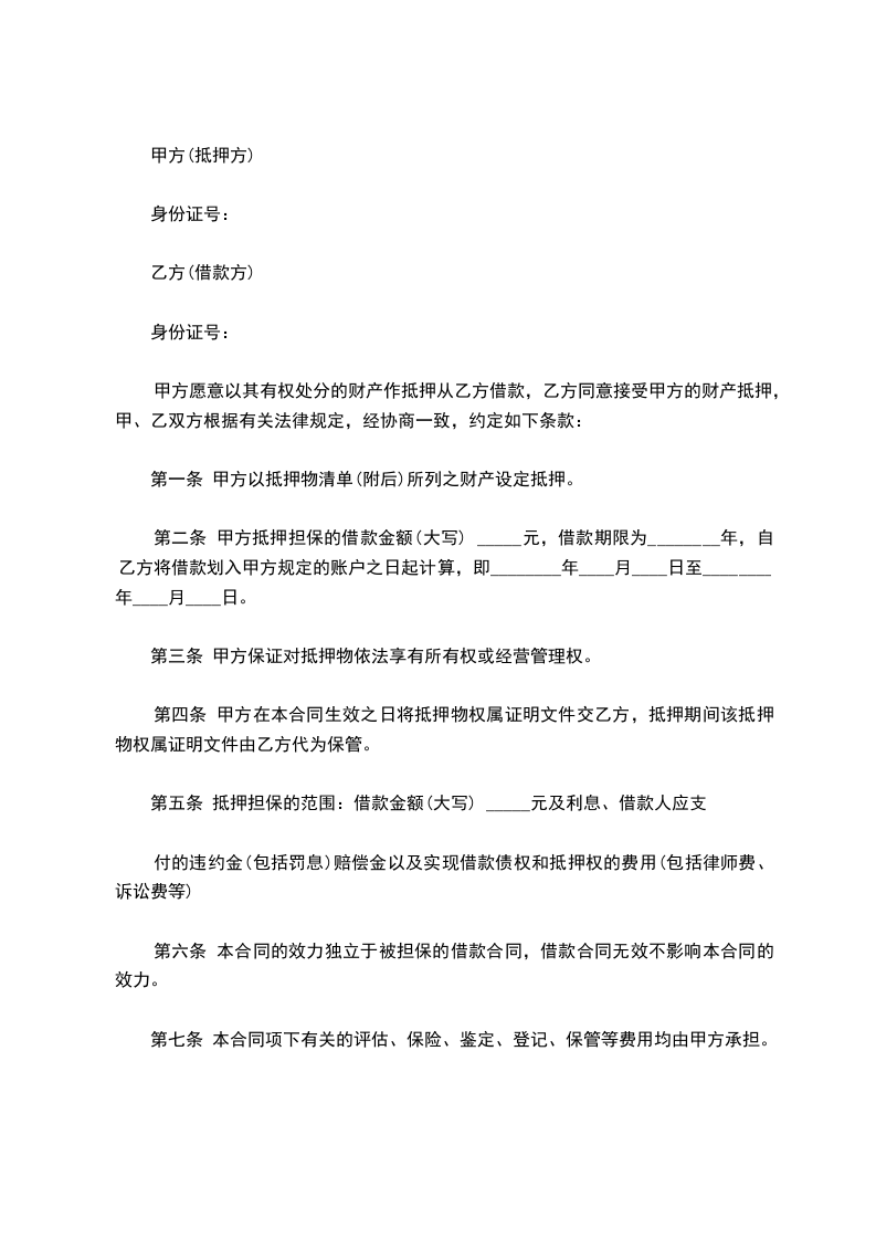 第一条 甲方以抵押物清单(附后)所列之财产设定抵押。