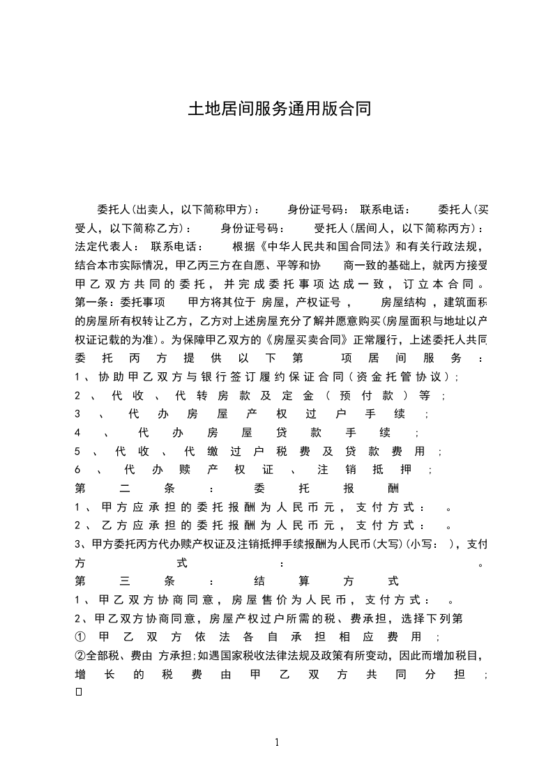 委托人(出卖人,以下简称甲方): 身份证号码: 联系电话: 委托人(买受人,以下简称乙方): 身份证号码: 受托人(居间人,以下简称丙方): 法定代表人: 联系电话: 根据《中华人民共和国民法典》和有关行政法规,结合本市实际情况,甲乙丙三方在自愿、平等和协 商一致的基础上,就丙方接受甲乙双方共同的委托,并完成委托事项达成一致,订立本合同。