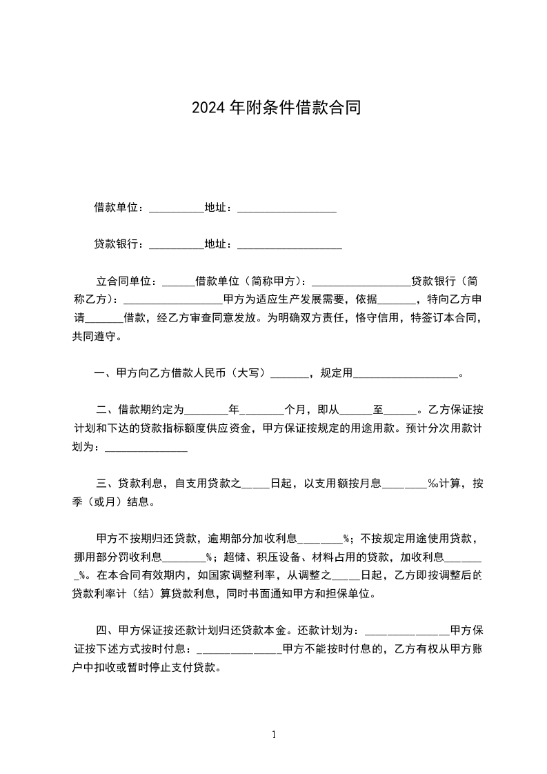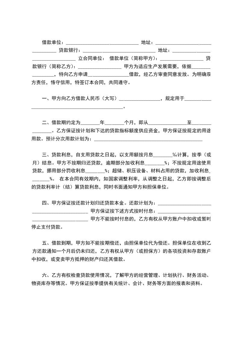 借款单位:______________________________ 地址:_________________________________ 贷款银行:______________________________ 地址:__________________________________ 立合同单位: 借款单位(简称甲方):__________________ 贷款银行(简称乙方):__________________ 甲方为适应生产发展需要,依据_________________,特向乙方申请_________________借款,经乙方审查同意发放。为明确双方责任,恪守信用,特签订本合同,共同遵守。