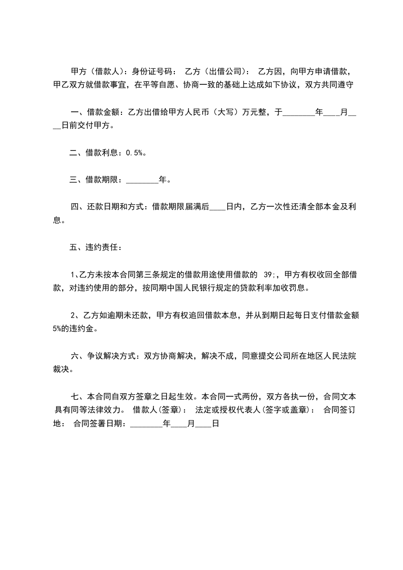 甲方(借款人):身份证号码: 乙方(出借公司): 乙方因,向甲方申请借款,甲乙双方就借款事宜,在平等自愿、协商一致的基础上达成如下协议,双方共同遵守。