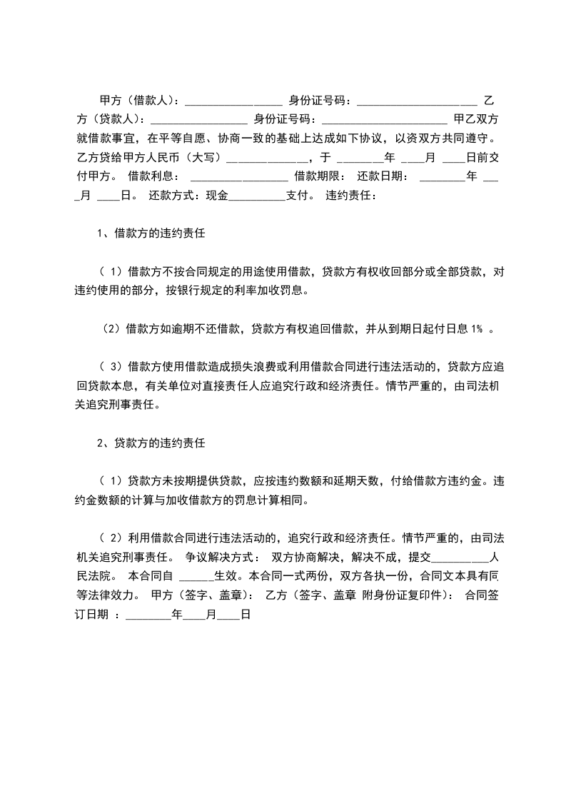 甲方(借款人):_________________ 身份证号码:_____________________ 乙方(贷款人):_________________ 身份证号码:______________________ 甲乙双方就借款事宜,在平等自愿、协商一致的基础上达成如下协议,以资双方共同遵守。 乙方贷给甲方人民币(大写)______________,于 ________年 ____月 ____日前交付甲方。 借款利息: _________________ 借款期限: 还款日期: ________年 ____月 ____日。 还款方式:现金__________支付。 违约责任: