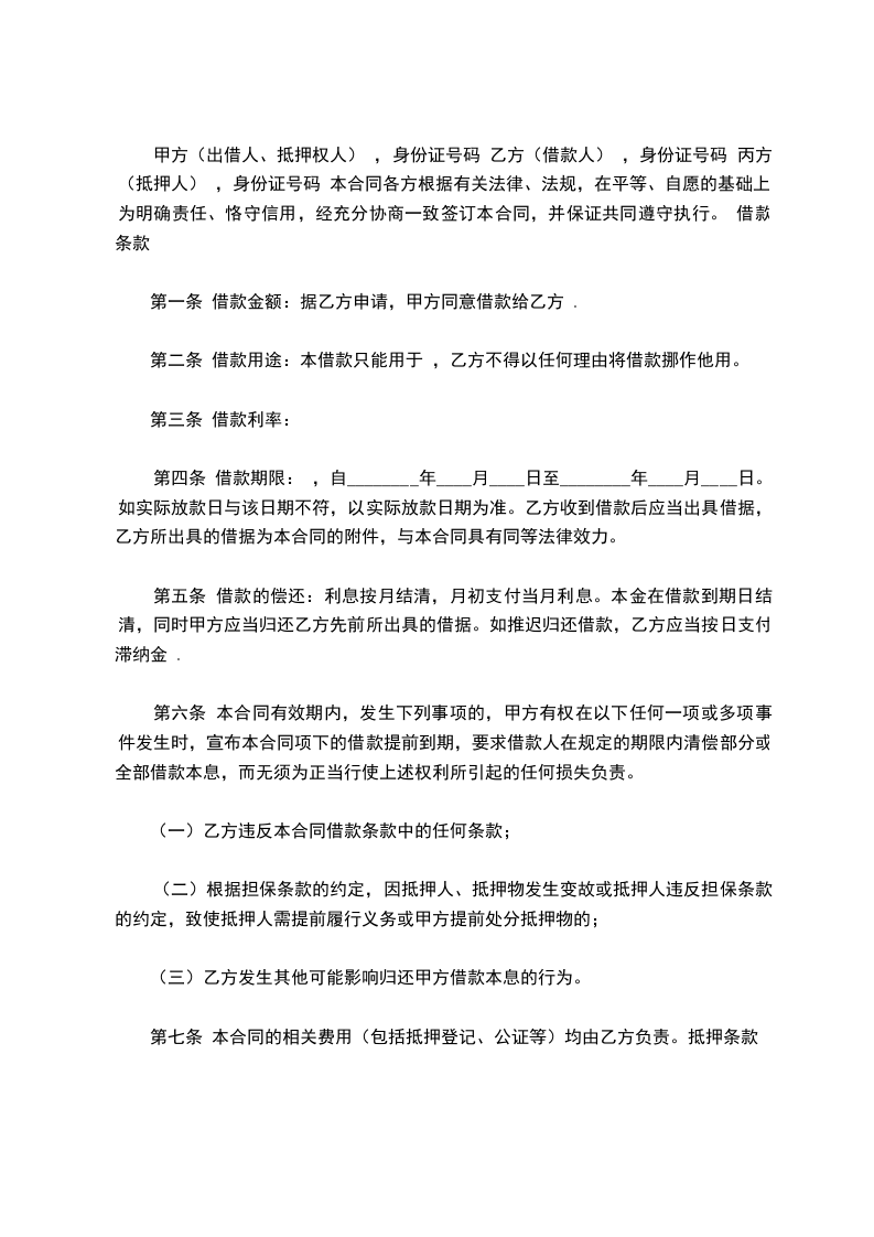 甲方(出借人、抵押权人) ,身份证号码 乙方(借款人) ,身份证号码 丙方(抵押人) ,身份证号码 本合同各方根据有关法律、法规,在平等、自愿的基础上,为明确责任、恪守信用,经充分协商一致签订本合同,并保证共同遵守执行。 借款条款