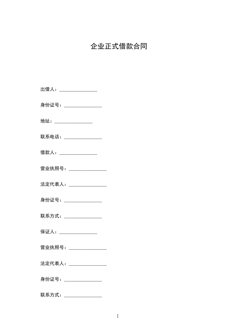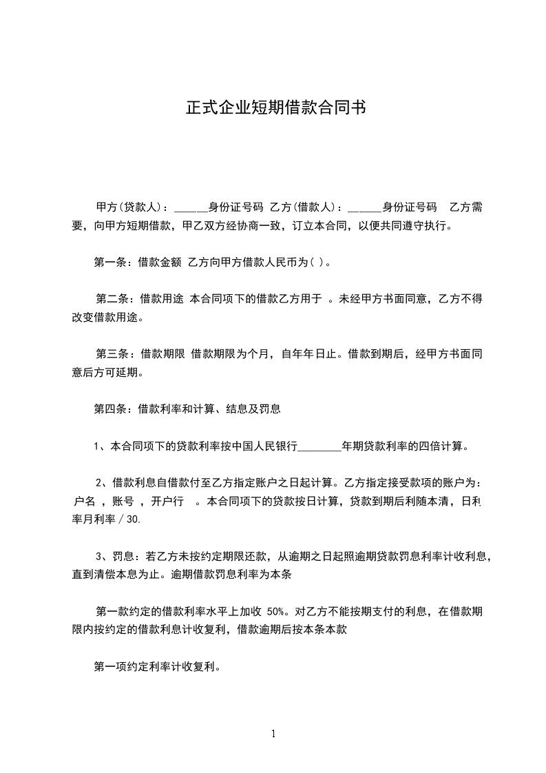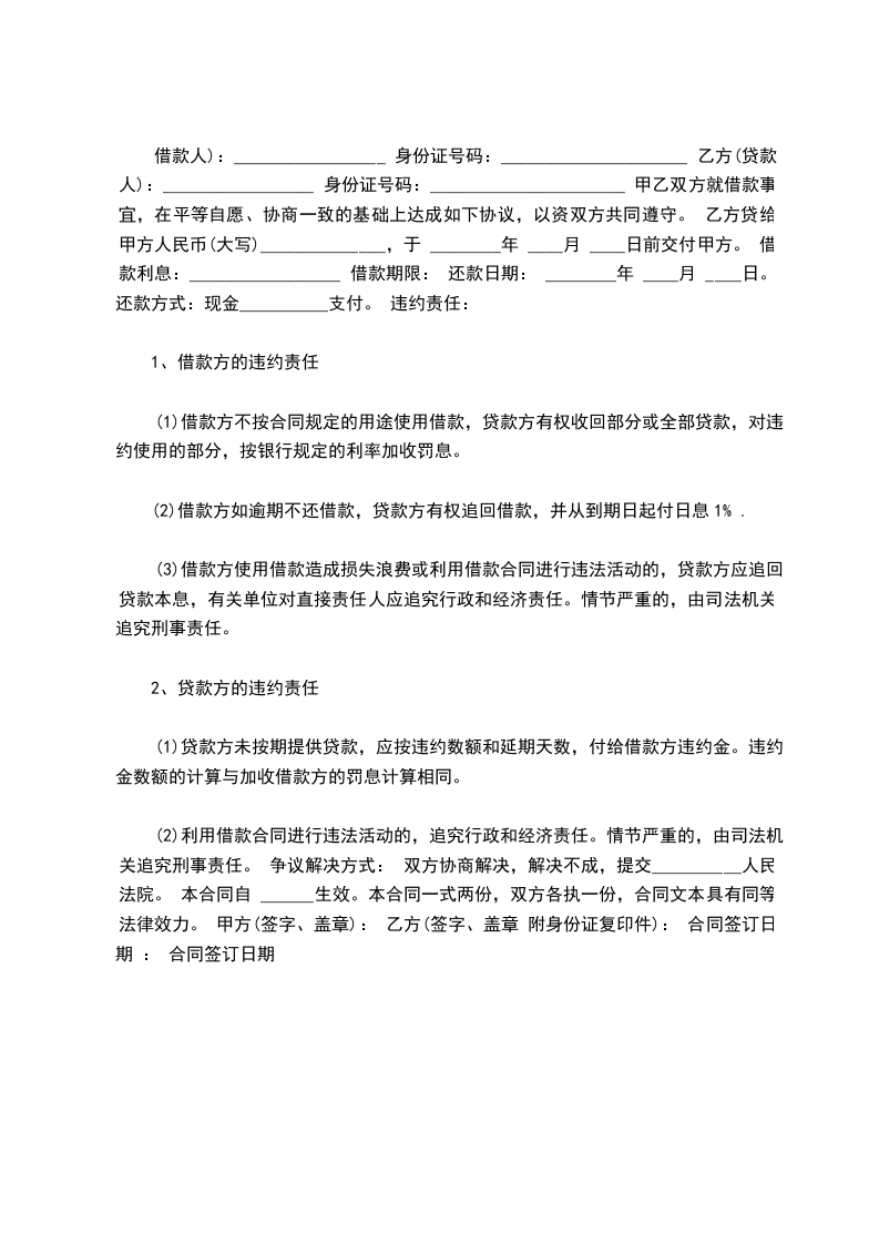 借款人):_________________ 身份证号码:_____________________ 乙方(贷款人):_________________ 身份证号码:______________________ 甲乙双方就借款事宜,在平等自愿、协商一致的基础上达成如下协议,以资双方共同遵守。 乙方贷给甲方人民币(大写)______________,于 ________年 ____月 ____日前交付甲方。 借款利息:_________________ 借款期限: 还款日期: ________年 ____月 ____日。 还款方式:现金__________支付。 违约责任: