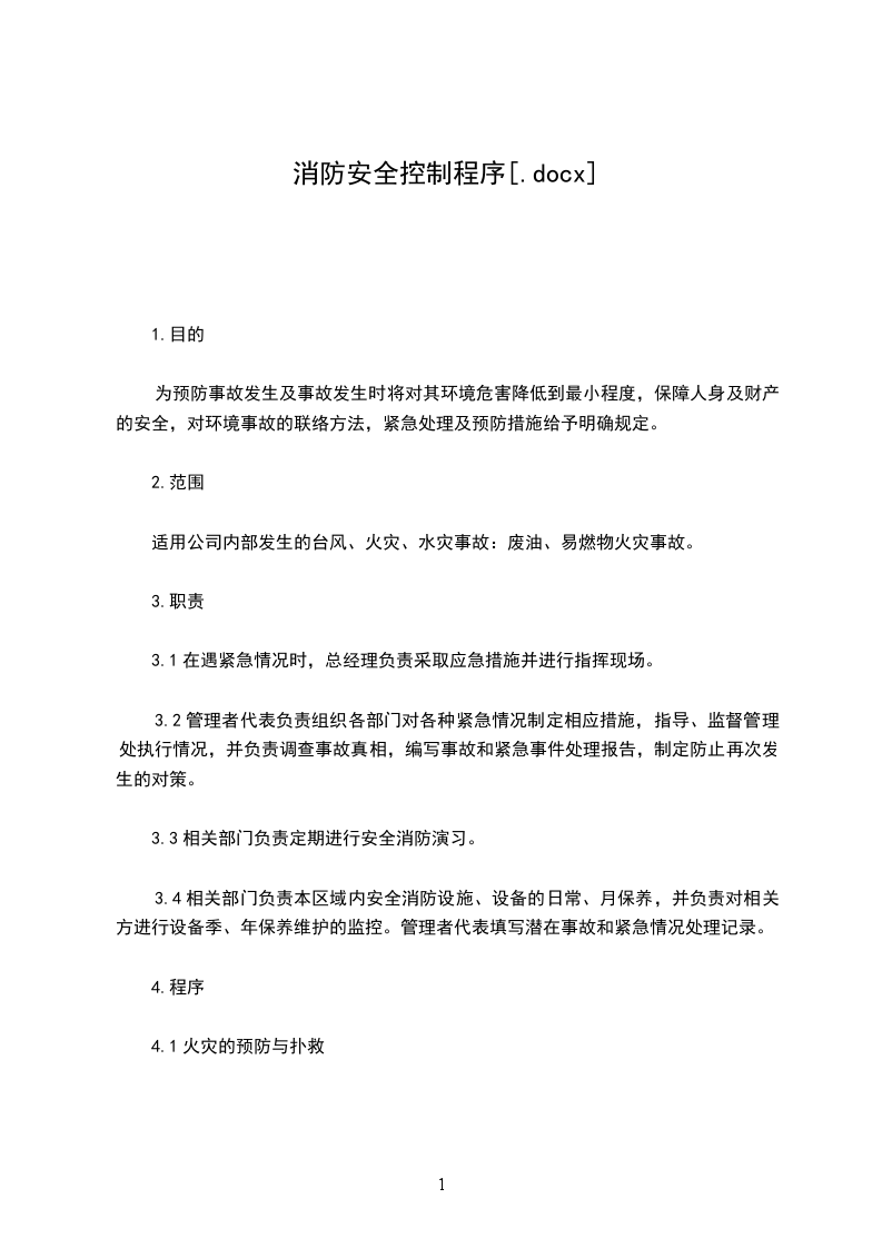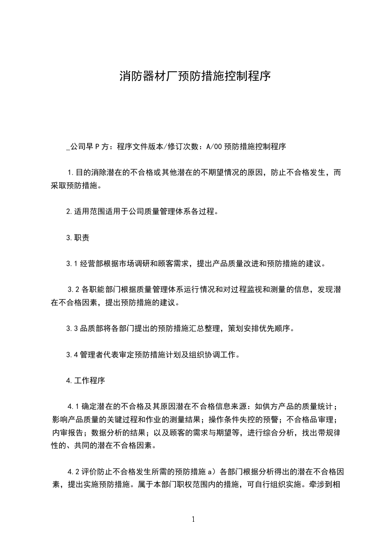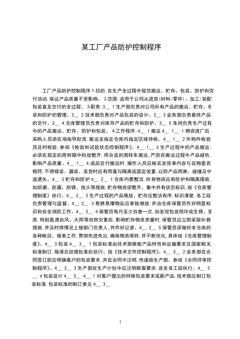 工厂产品防护控制程序⒈目的:在生产全过程中规范搬运、贮存、包装、防护和交付活动,保证产品质量不受影响。⒉范围:适用于公司从进货(材料/零件)、加工/装配、包装直至交付的全过程。⒊职责:3__ 1生产部负责对公司所有产品的搬运、贮存、包装和防护的管理。3__ 2技术部负责对产品包装的设计。3__ 3业务部负责最终产品的交付。3__ 4仓库管理员负责对库存产品的贮存和防护。3__ 5车间负责生产过程中的产品搬运、贮存、防护和包装。⒋工作程序:4__ 1搬运4__ 1__ 1物资进厂后,采购人员须在场指导卸货,搬运至指定仓库内指定区域待检。4__ 1__ 2外购件检验员及时检验,参阅《检验和试验状态控制程序》。4__ 1__ 3生产过程中的产品搬运,必须在规定的周转箱中码放整齐,用合适的周转车搬运,严防在搬运过程中产品碰伤,影响产品质量。4__ 1__ 4成品交付搬运时,操作人员应核实发货单内容与实物是否相符,不得错装、漏装。装货时应有雨蓬与隔离或固定装置,以防产品雨淋、碰撞及中途遗失。4__ 2贮存和防护4__ 2__ 1仓库内要整洁,所有物资应有防护和隔离措施,如防潮、防漏、防锈、放火等措施,贮存物资须整齐、集中并有状态标识,按《仓库管理制度》执行。4__ 2__ 2生产过程的产品堆放、贮存应整洁有序,标识清楚,各工段负责管理与监督。4__ 2__ 3易燃易爆物品应单独堆放,并由仓库保管员作好明显标识和安全消防工作。4__ 2__ 4保管员每月至少自查一次,如发现包装损坏或生锈、变质,特别是遇台风、大雨等自然灾害后,影响贮存物资质量时,保管员应立即采取补救措施,并及时将情况上报部门负责人,并作好记录。4__ 2__ 5保管员须做好本仓库的各种帐目、报表工作,贯彻先进先出,确保物资周转,并不断优化,具体按《仓库管理制度》。4__ 3包装4__ 3__ 1包装标准由技术部根据产品特性和运输要求及国家相关标准制订,报请总经理批准后执行。按《技术文件控制程序》。4__ 3__ 2业务部在合同签订前应明确客户的包装要求,并在合同中注明,传递给生产部。参阅《合同评审控制程序》。4__ 3__ 3生产部在生产计划中应注明顾客要求,送发各工段执行。4__ 3__ 4包装设计4__ 3__ 4__ 1对客户提出的特殊包装要求或新产品,技术部应制订包装标准,包装标准的制订参见4__ 3__
