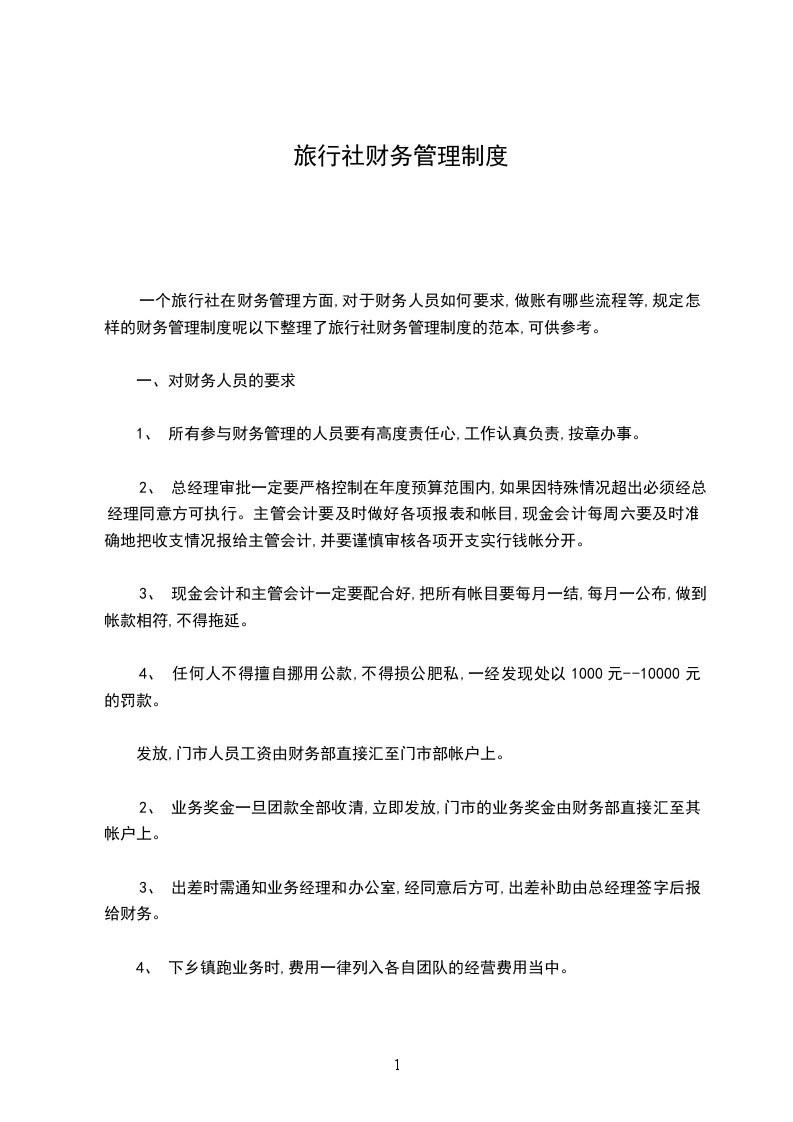 一个旅行社在财务管理方面,对于财务人员如何要求,做账有哪些流程等,规定怎样的财务管理制度呢以下整理了旅行社财务管理制度的范本,可供参考。