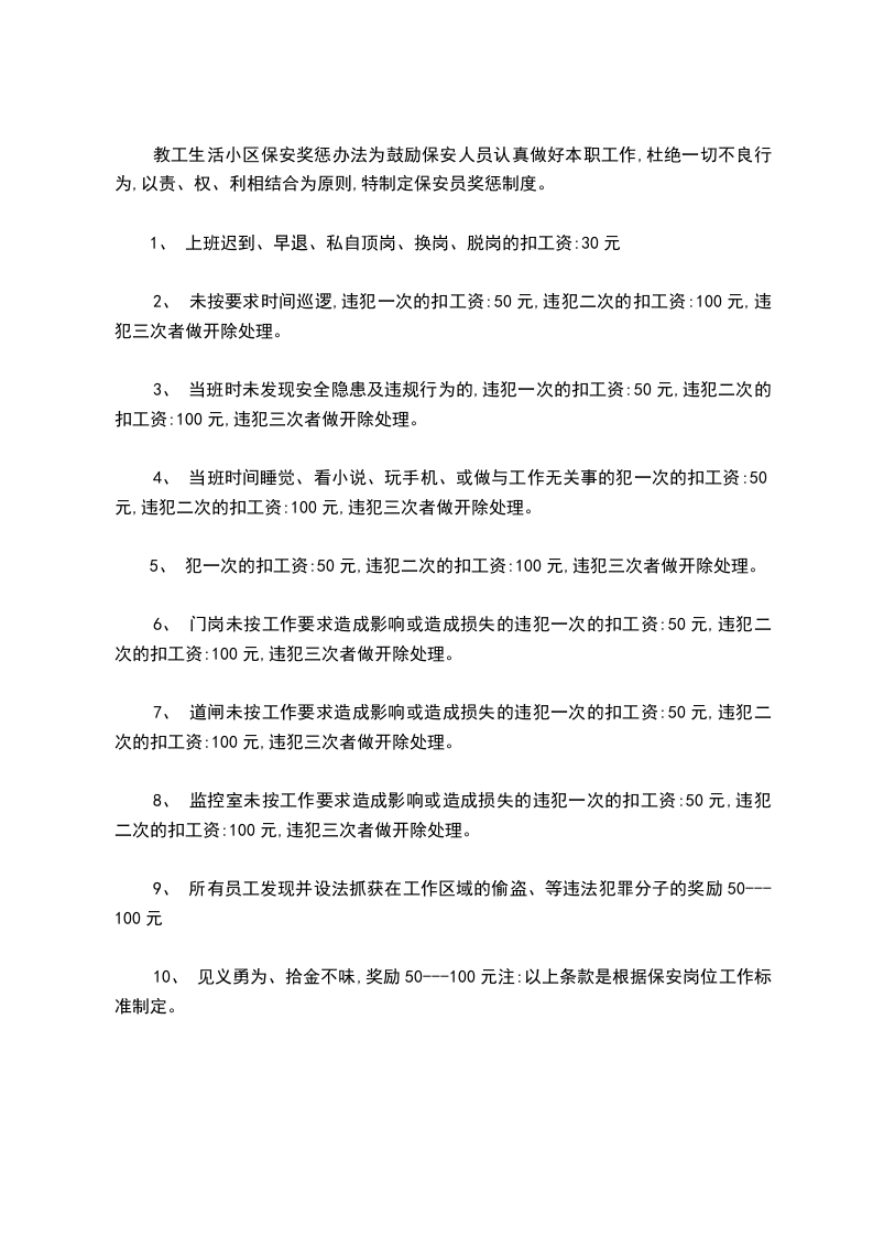 教工生活小区保安奖惩办法为鼓励保安人员认真做好本职工作,杜绝一切不良行为,以责、权、利相结合为原则,特制定保安员奖惩制度。