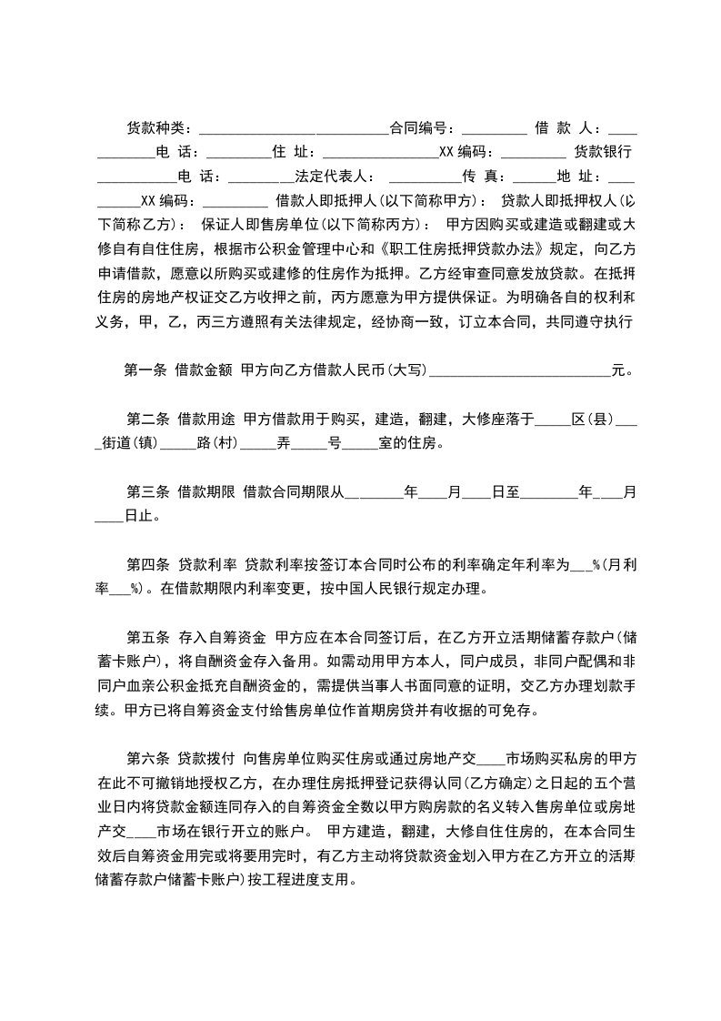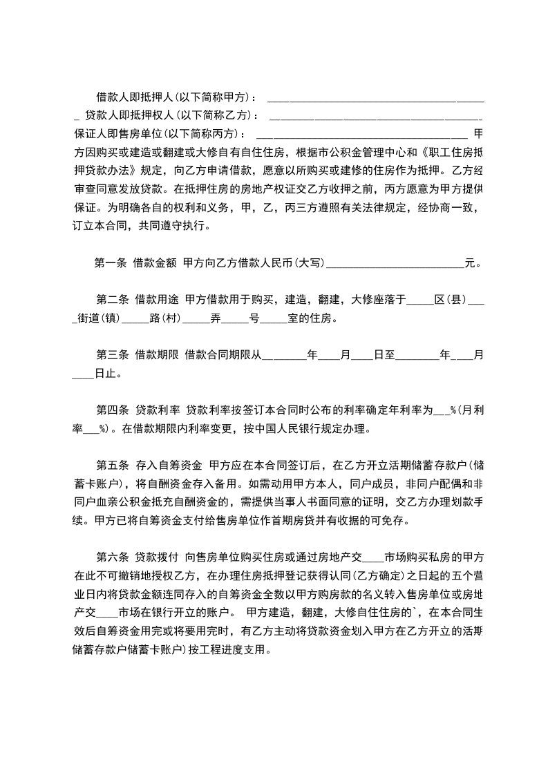 借款人即抵押人(以下简称甲方): ________________________________________ 贷款人即抵押权人(以下简称乙方): ______________________________________ 保证人即售房单位(以下简称丙方): ______________________________________ 甲方因购买或建造或翻建或大修自有自住住房,根据市公积金管理中心和《职工住房抵押贷款办法》规定,向乙方申请借款,愿意以所购买或建修的住房作为抵押。乙方经审查同意发放贷款。在抵押住房的房地产权证交乙方收押之前,丙方愿意为甲方提供保证。为明确各自的权利和义务,甲,乙,丙三方遵照有关法律规定,经协商一致,订立本合同,共同遵守执行。