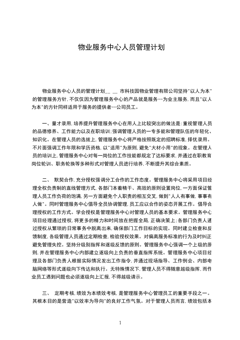 物业服务中心人员的管理计划__ __ 市科技园物业管理有限公司坚持"以人为本"的管理服务方针,不仅仅因为管理服务中心的产品就是服务--为业主服务,而且"以人为本"的方针同样适用于服务的提供者--公司员工。