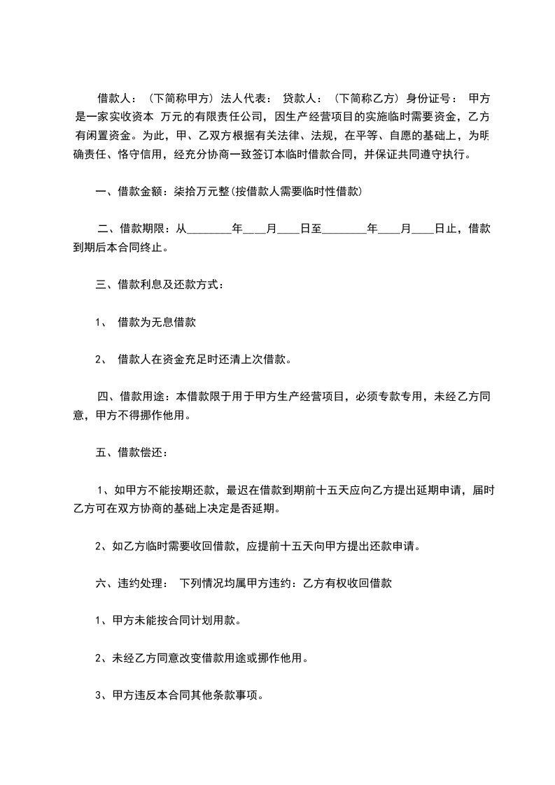 借款人: (下简称甲方) 法人代表: 贷款人: (下简称乙方) 身份证号: 甲方是一家实收资本 万元的有限责任公司,因生产经营项目的实施临时需要资金,乙方有闲置资金。为此,甲、乙双方根据有关法律、法规,在平等、自愿的基础上,为明确责任、恪守信用,经充分协商一致签订本临时借款合同,并保证共同遵守执行。