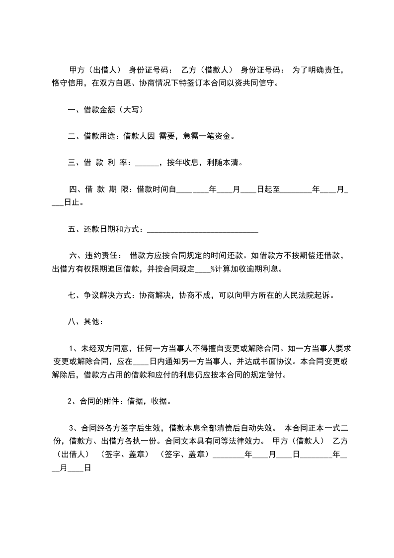 甲方(出借人) 身份证号码: 乙方(借款人) 身份证号码: 为了明确责任,恪守信用,在双方自愿、协商情况下特签订本合同以资共同信守。