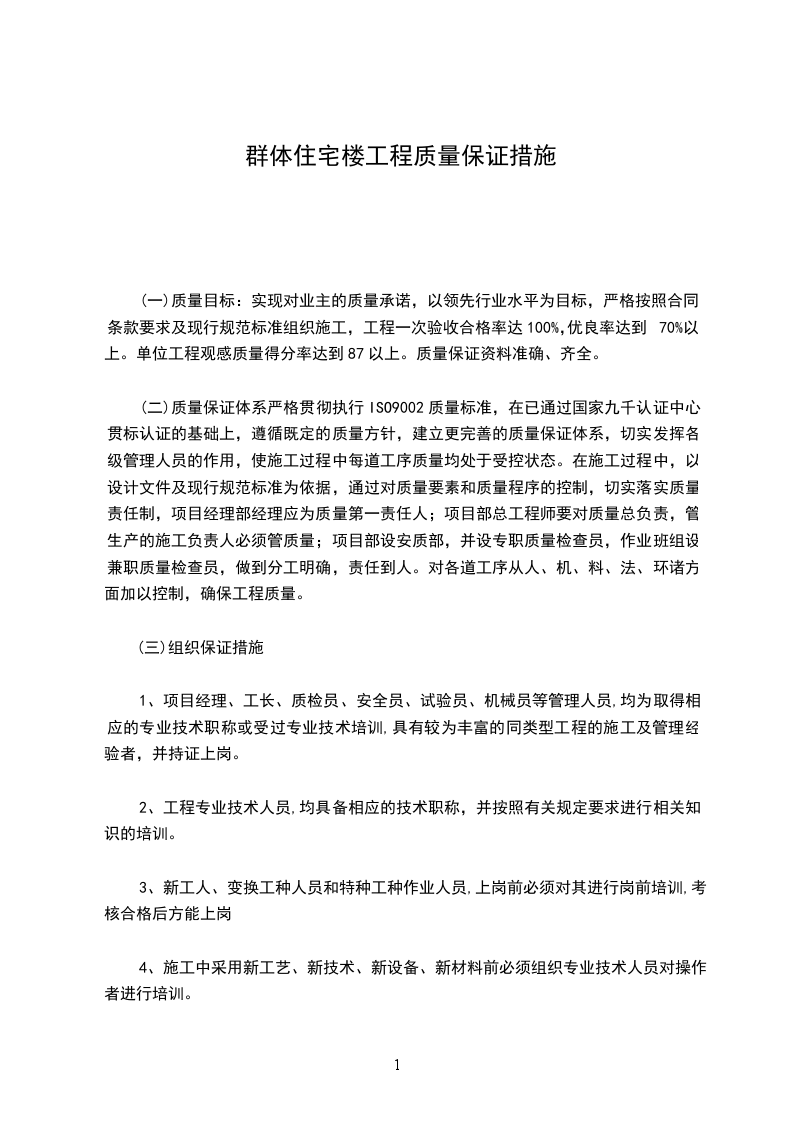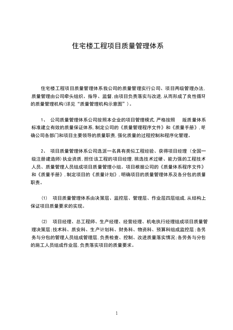 住宅楼工程质量保证体系:质量标准的要素我公司按照国际标准化组织颁布的1SO9001: 质量标准,建立起一套行之有效的文件化的质量保证体系。该体系包括了从工程项目的投标,签定合同到竣工交付使用,直到交工后保修与回访的全过程,充分体现了ISO9001: 中19个要素的要求。该体系以质量手册为核心和指导,以程序文件为日常工作准则,以作业指导书为操作的具体指导,所有质量活动都有质量计划并具体反映到质量记录中,使得施工过程标准化。规范化、有章可循。责任分明。
