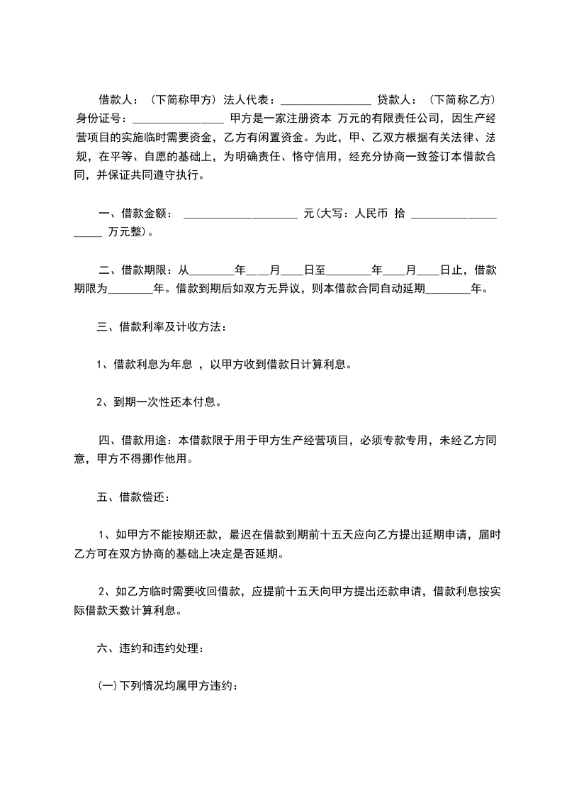 借款人: (下简称甲方) 法人代表:________________ 贷款人: (下简称乙方) 身份证号:________________ 甲方是一家注册资本 万元的有限责任公司,因生产经营项目的实施临时需要资金,乙方有闲置资金。为此,甲、乙双方根据有关法律、法规,在平等、自愿的基础上,为明确责任、恪守信用,经充分协商一致签订本借款合同,并保证共同遵守执行。