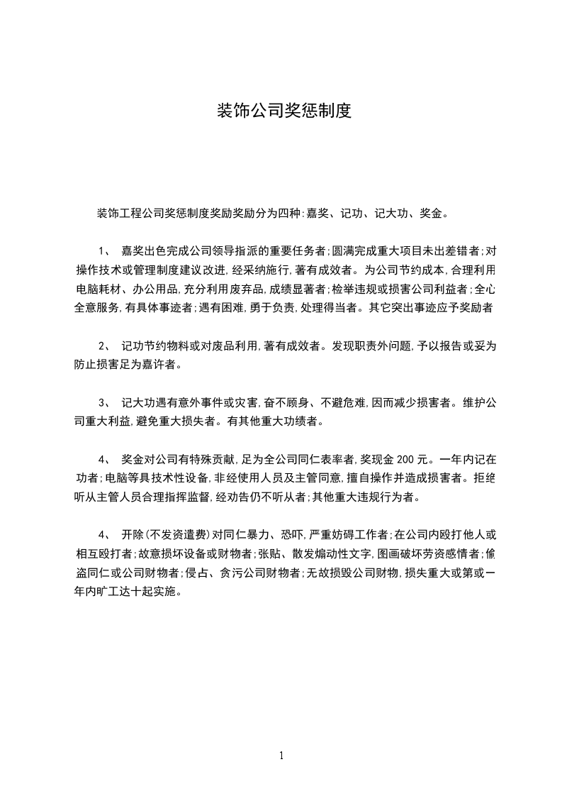 装饰工程公司奖惩制度奖励奖励分为四种:嘉奖、记功、记大功、奖金。