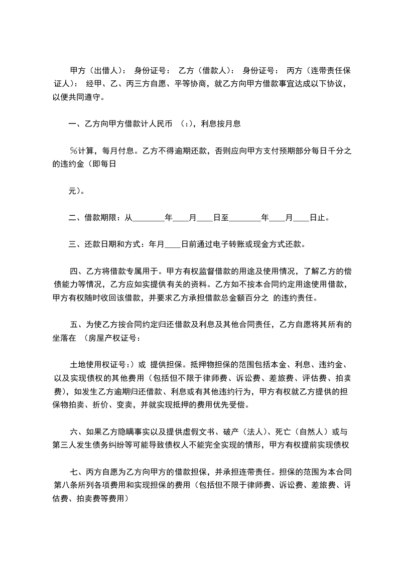 甲方(出借人): 身份证号: 乙方(借款人): 身份证号: 丙方(连带责任保证人): 经甲、乙、丙三方自愿、平等协商,就乙方向甲方借款事宜达成以下协议,以便共同遵守。
