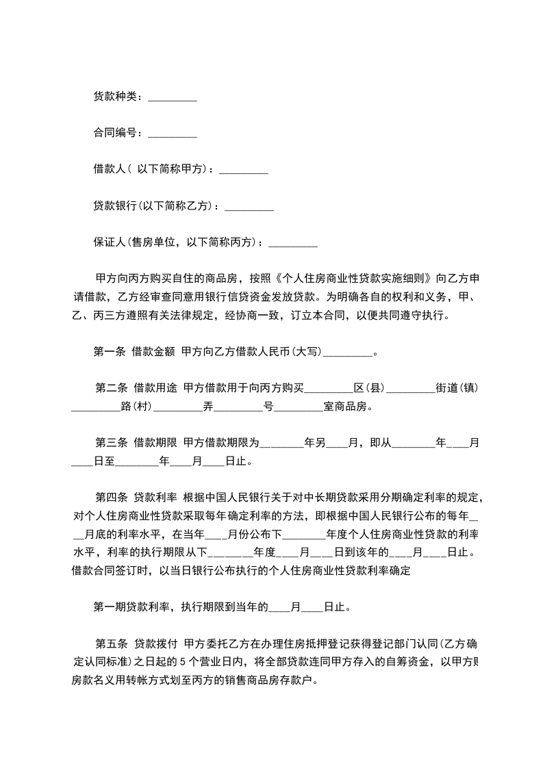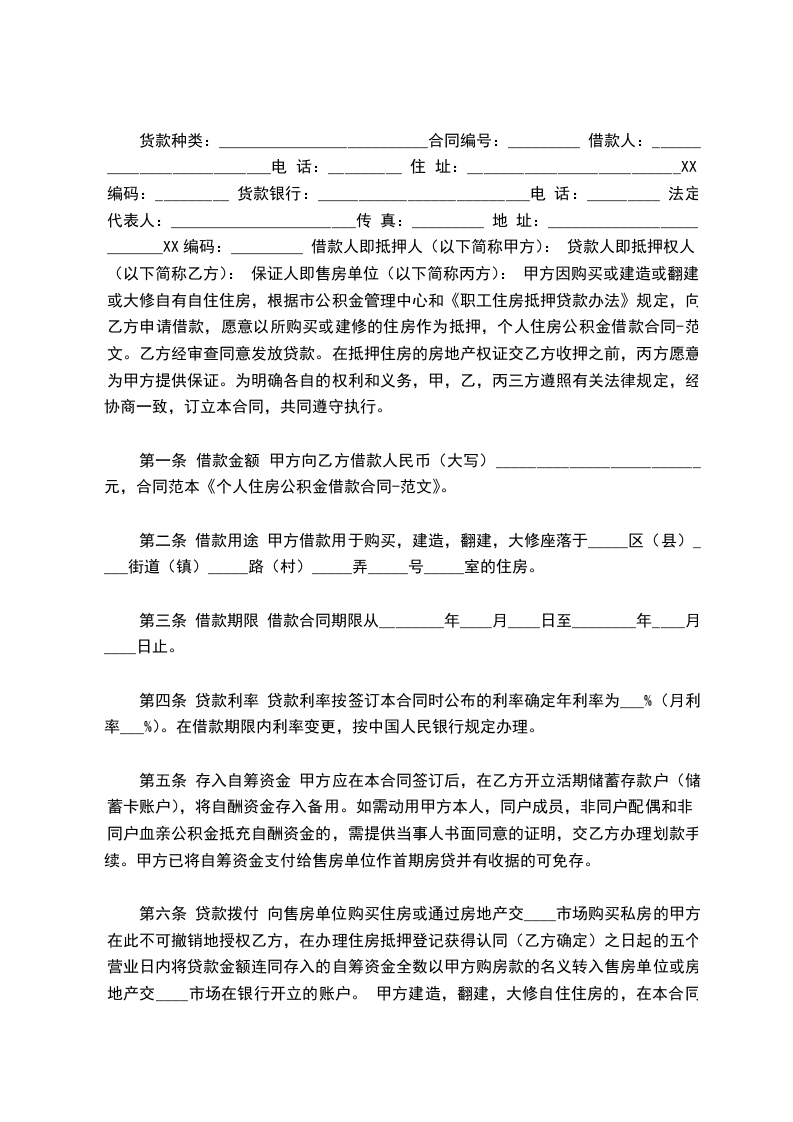货款种类:__________________________合同编号:_________ 借款人:__________________________电 话:_________ 住 址:__________________________XX编码:_________ 货款银行:__________________________电 话:_________ 法定代表人:_______________________传 真:_________ 地 址:__________________________XX编码:_________ 借款人即抵押人(以下简称甲方): 贷款人即抵押权人(以下简称乙方): 保证人即售房单位(以下简称丙方): 甲方因购买或建造或翻建或大修自有自住住房,根据市公积金管理中心和《职工住房抵押贷款办法》规定,向乙方申请借款,愿意以所购买或建修的住房作为抵押,个人住房公积金借款合同-范文。乙方经审查同意发放贷款。在抵押住房的房地产权证交乙方收押之前,丙方愿意为甲方提供保证。为明确各自的权利和义务,甲,乙,丙三方遵照有关法律规定,经协商一致,订立本合同,共同遵守执行。