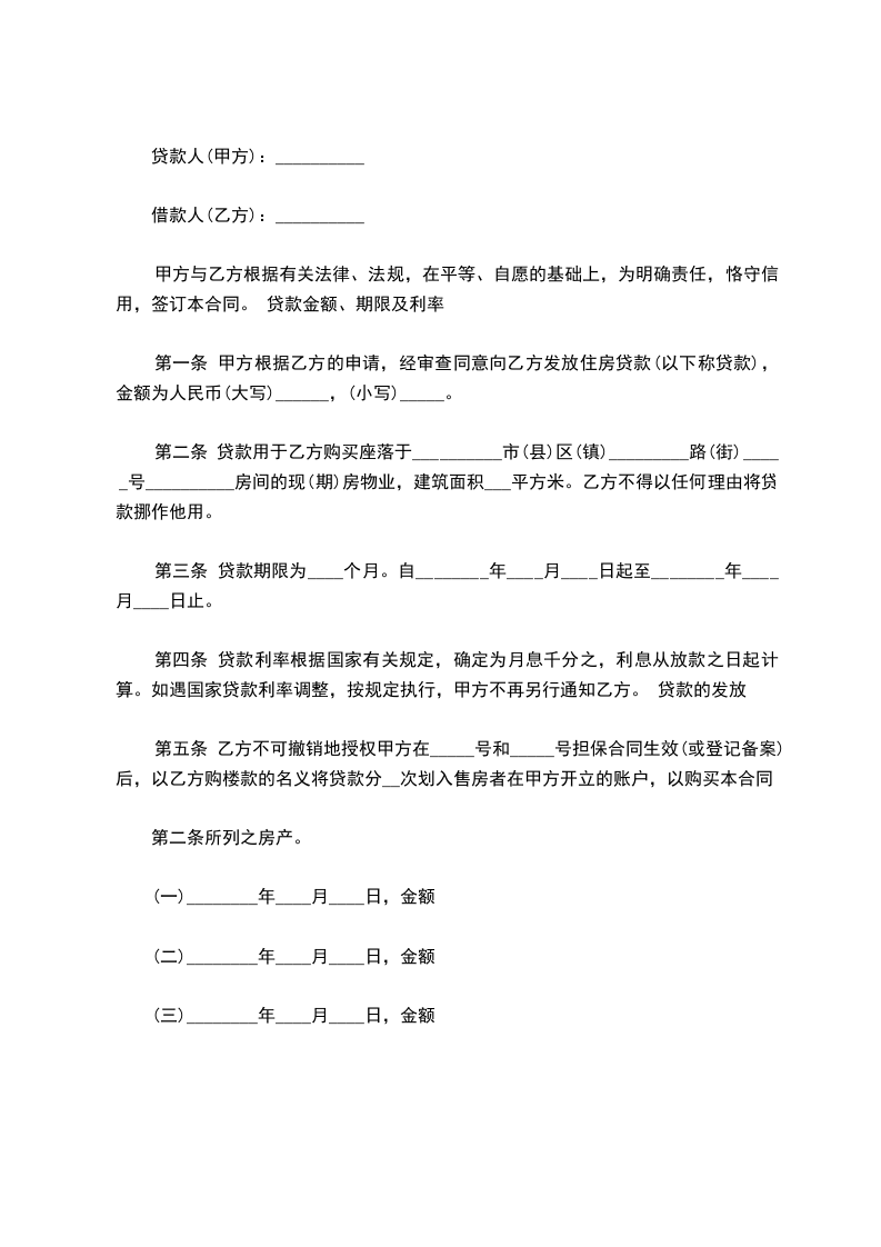 第一条 甲方根据乙方的申请,经审查同意向乙方发放住房贷款(以下称贷款),金额为人民币(大写)______,(小写)_____。