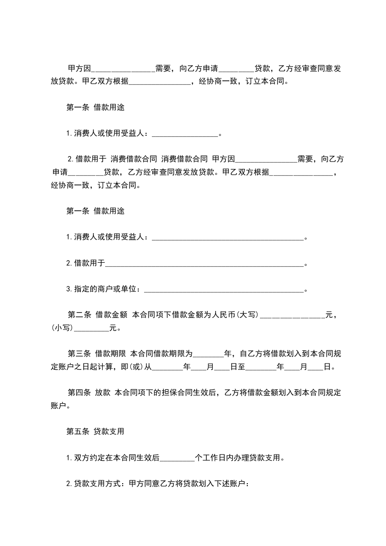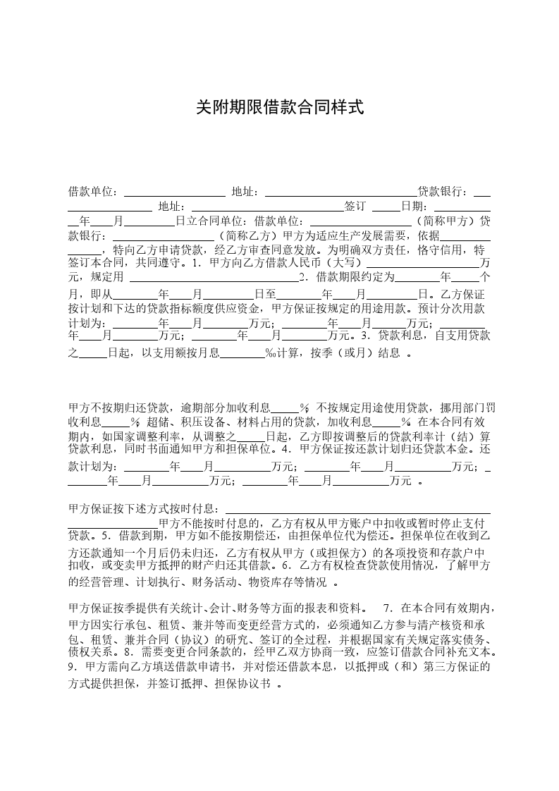 2、借款期限约定为___个月,即从________年____月____日起至 ________年____月 ____日。乙方保证在订立本合同后____日内将贷款资金足额划入约定账户, 甲方保证将 借款只能用于项目的直接建设用款。