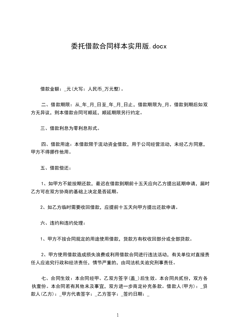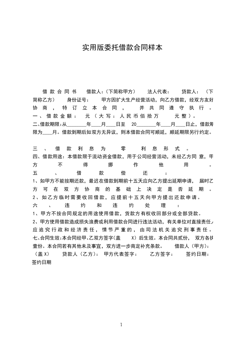 七、合同生效:本合同经甲、乙双方签字(盖X)后生效。本合同共贰份, 双方各执壹份。本合同若有其他未及事宜,双方进一步商定补充条款。 借款人(甲方):(盖X) 贷款人(乙方): 甲方代表签字: 乙方签字: 签约日期: 签约日期