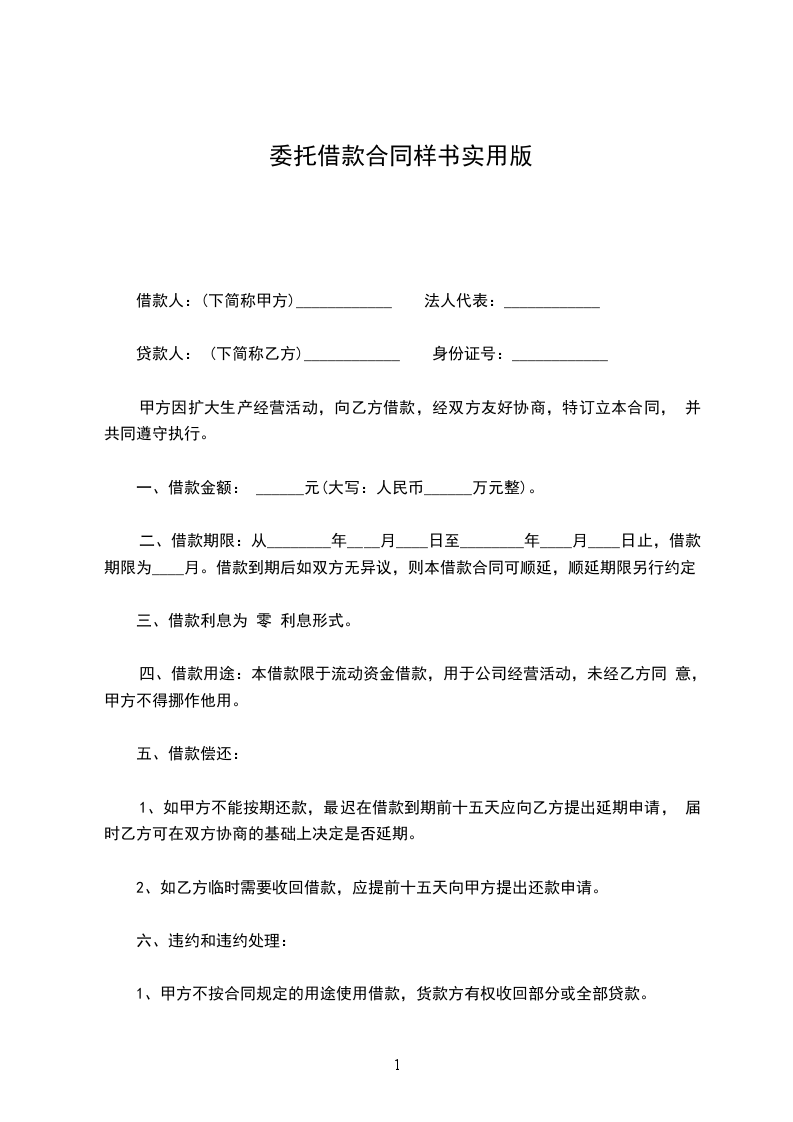 借 款 合 同 书 借款人:(下简称甲方) 法人代表: 贷款人: (下简称乙方) 身份证号: 甲方因扩大生产经营活动,向乙方借款,经双方友好协商,特订立本合同, 并共同遵守执行。