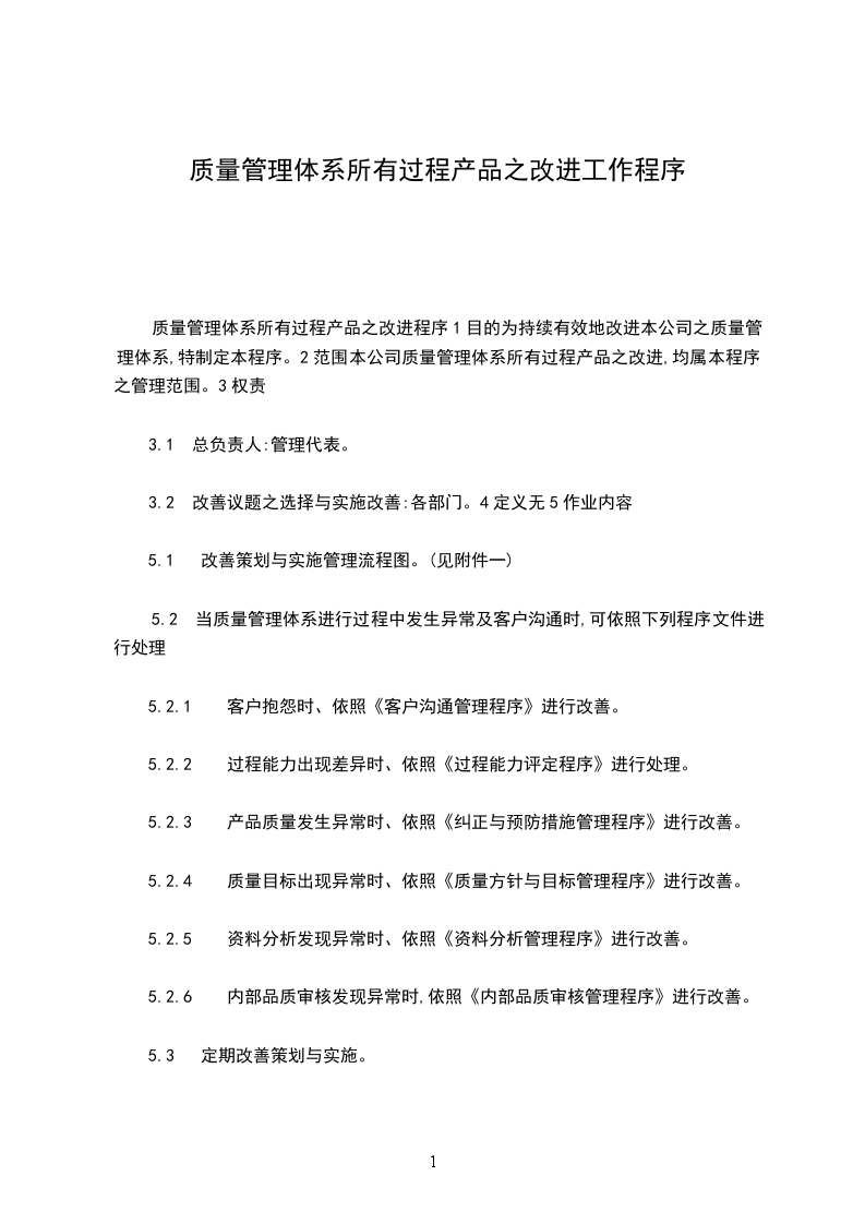 质量管理体系所有过程产品之改进程序1目的为持续有效地改进本公司之质量管理体系,特制定本程序。2范围本公司质量管理体系所有过程产品之改进,均属本程序之管理范围。3权责