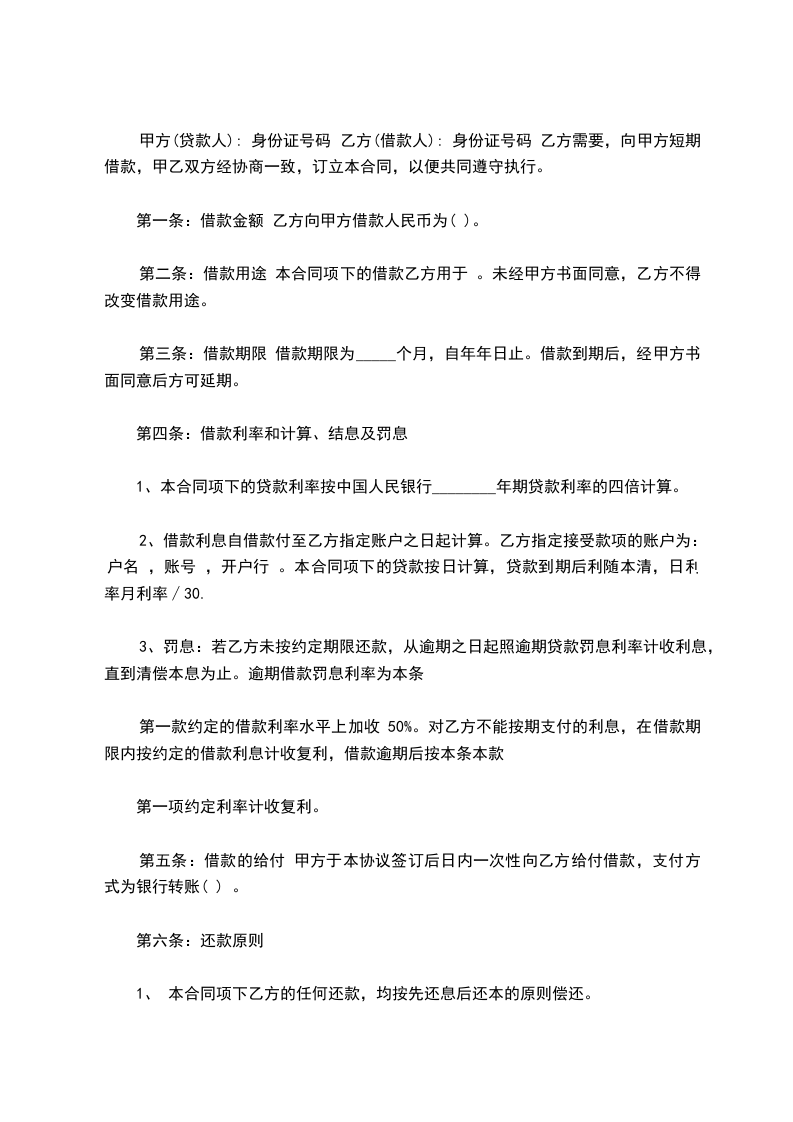 甲方(贷款人): 身份证号码 乙方(借款人): 身份证号码 乙方需要,向甲方短期借款,甲乙双方经协商一致,订立本合同,以便共同遵守执行。