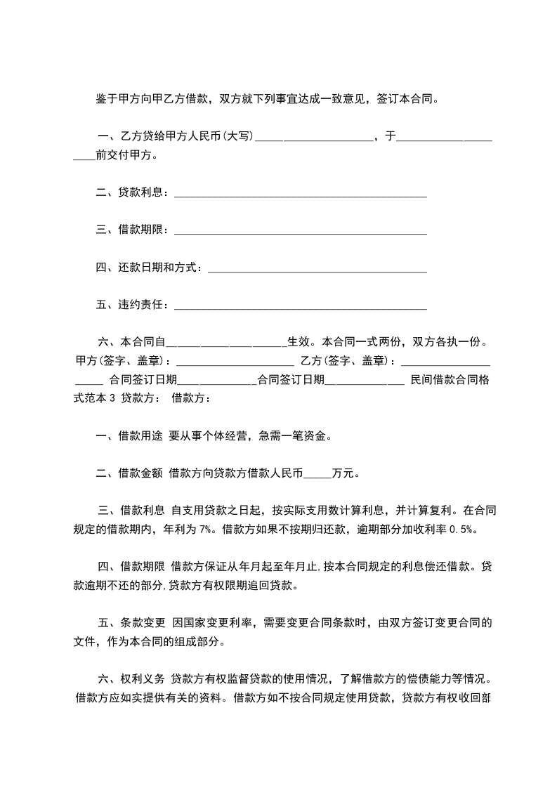 六、本合同自_____________________生效。本合同一式两份,双方各执一份。 甲方(签字、盖章):_____________________ 乙方(签字、盖章):_____________________ 合同签订日期______________合同签订日期______________ 民间借款合同格式范本3 贷款方: 借款方: