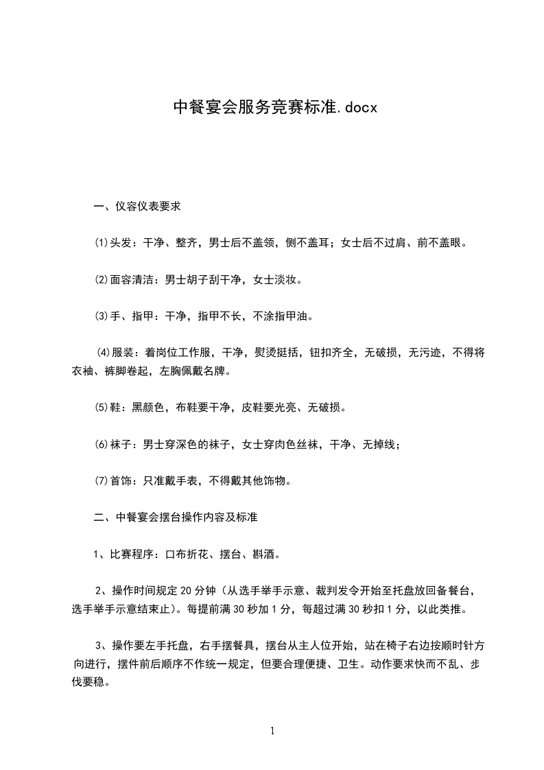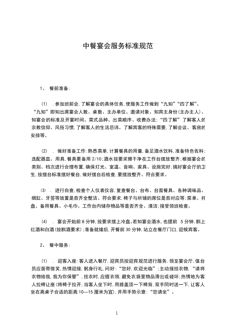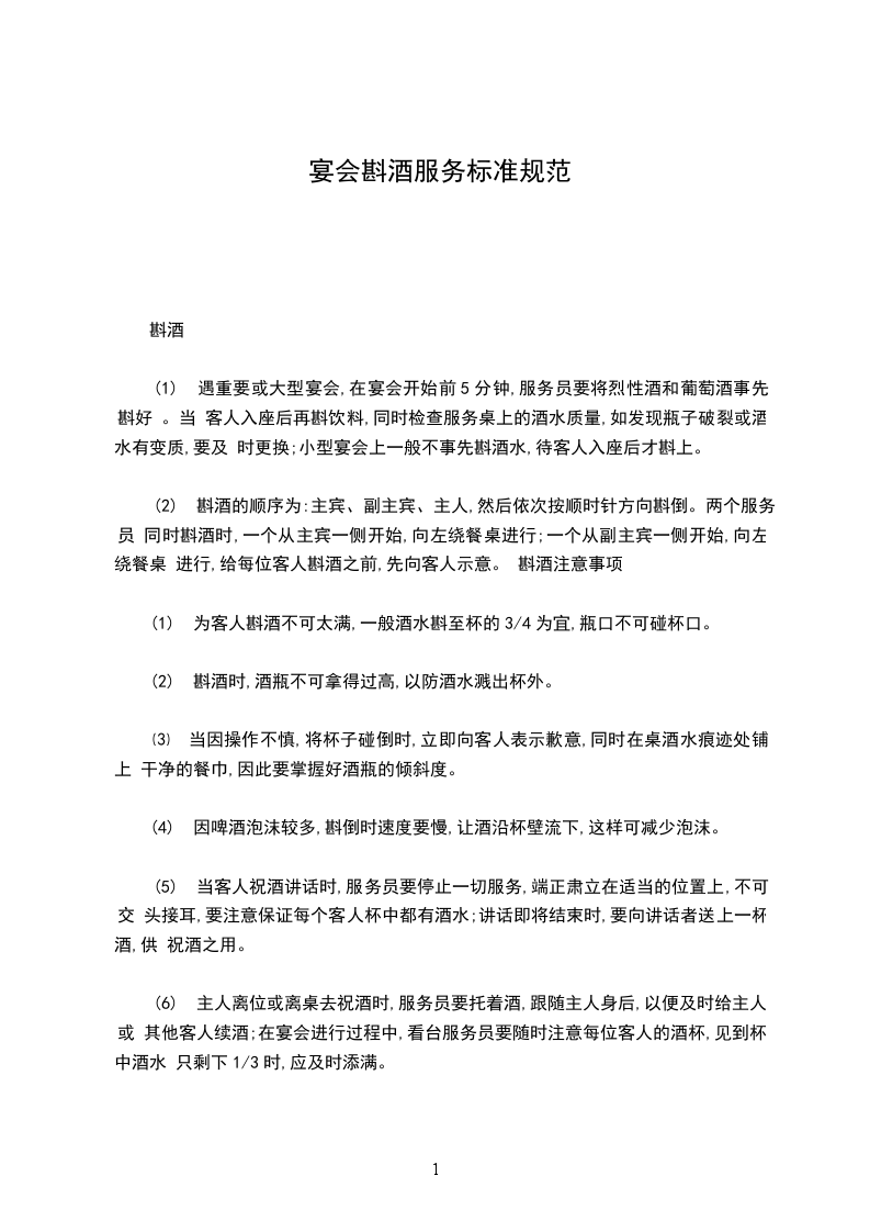 (1) 为客人拉椅,打开餐巾,折去筷子套,然后送上各种酒水,待客人选定后为客人斟倒;先斟饮料,再斟葡萄酒,最后斟烈性酒。