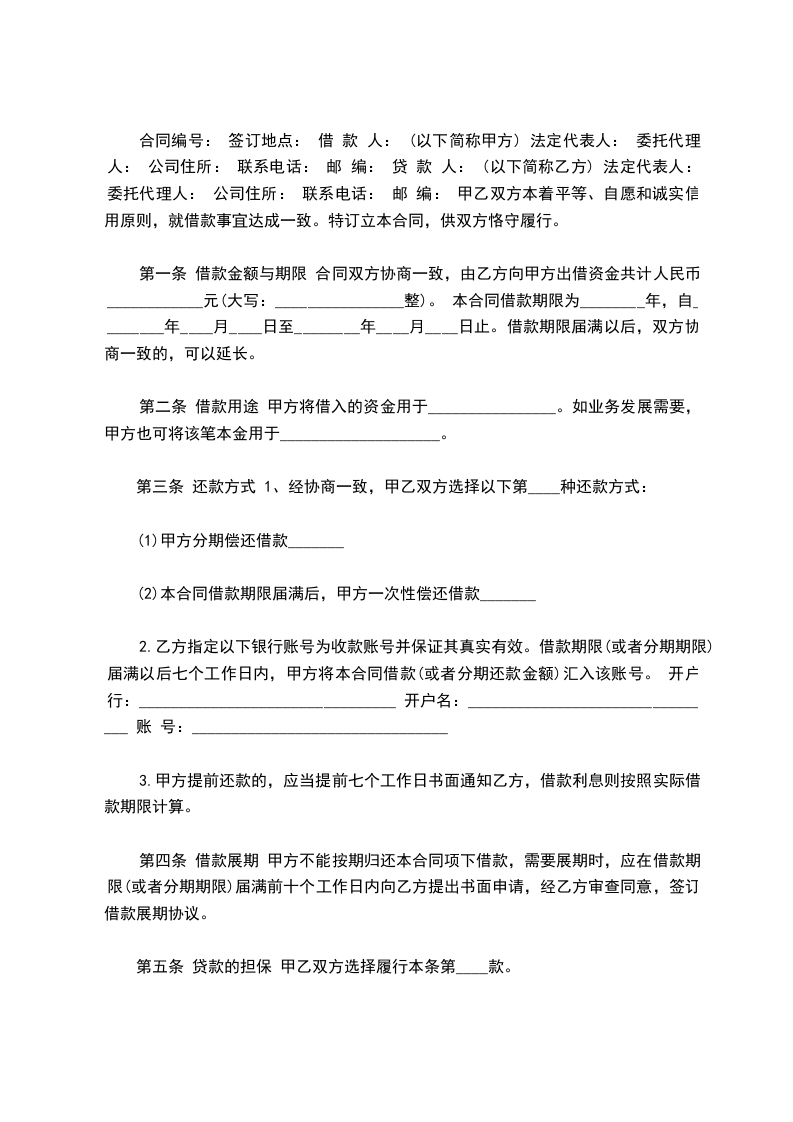 合同编号: 签订地点: 借 款 人: (以下简称甲方) 法定代表人: 委托代理人: 公司住所: 联系电话: 邮 编: 贷 款 人: (以下简称乙方) 法定代表人: 委托代理人: 公司住所: 联系电话: 邮 编: 甲乙双方本着平等、自愿和诚实信用原则,就借款事宜达成一致。特订立本合同,供双方恪守履行。