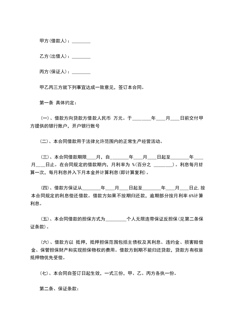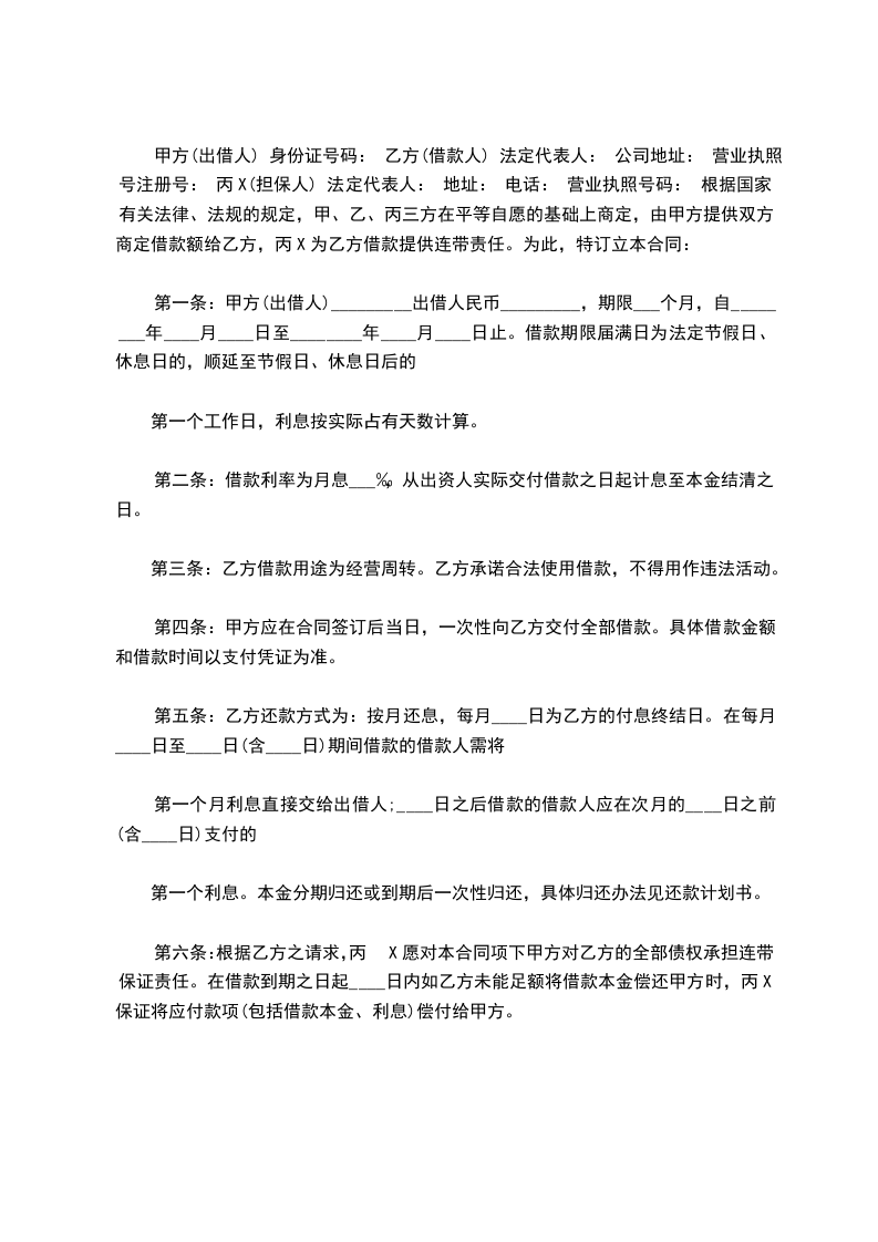 甲方(出借人) 身份证号码: 乙方(借款人) 法定代表人: 公司地址: 营业执照号注册号: 丙X(担保人) 法定代表人: 地址: 电话: 营业执照号码: 根据国家有关法律、法规的规定,甲、乙、丙三方在平等自愿的基础上商定,由甲方提供双方商定借款额给乙方,丙X为乙方借款提供连带责任。为此,特订立本合同: