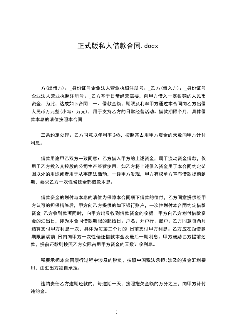 1、乙方未按照合同约定期限每月____日(含____日)之前支付利息,由丙X于____日内代为偿付(节假日顺延),同时乙方应自逾期之日起按借款金额每日千分之五向丙X支付滞纳金。