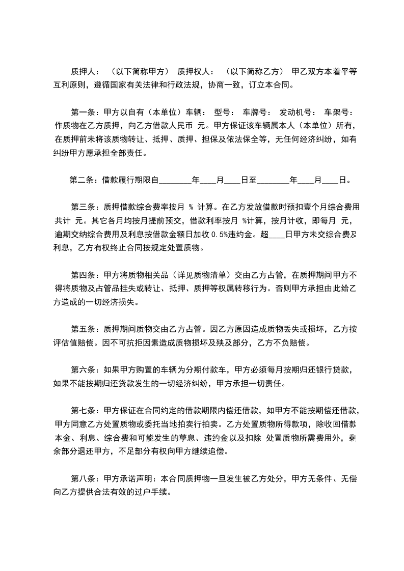 第一条:甲方以自有(本单位)车辆: 型号: 车牌号: 发动机号: 车架号: 作质物在乙方质押,向乙方借款人民币 元。甲方保证该车辆属本人(本单位)所有,在质押前未将该质物转让、抵押、质押、担保及依法保全等,无任何经济纠纷,如有纠纷甲方愿承担全部责任。