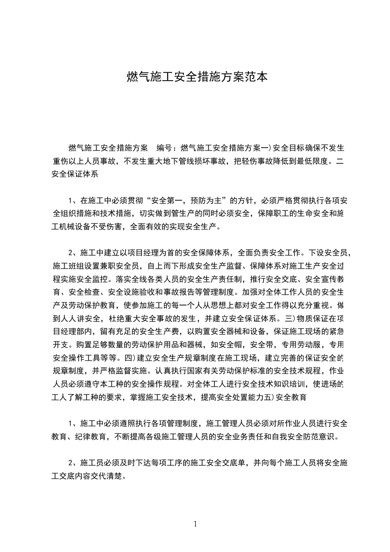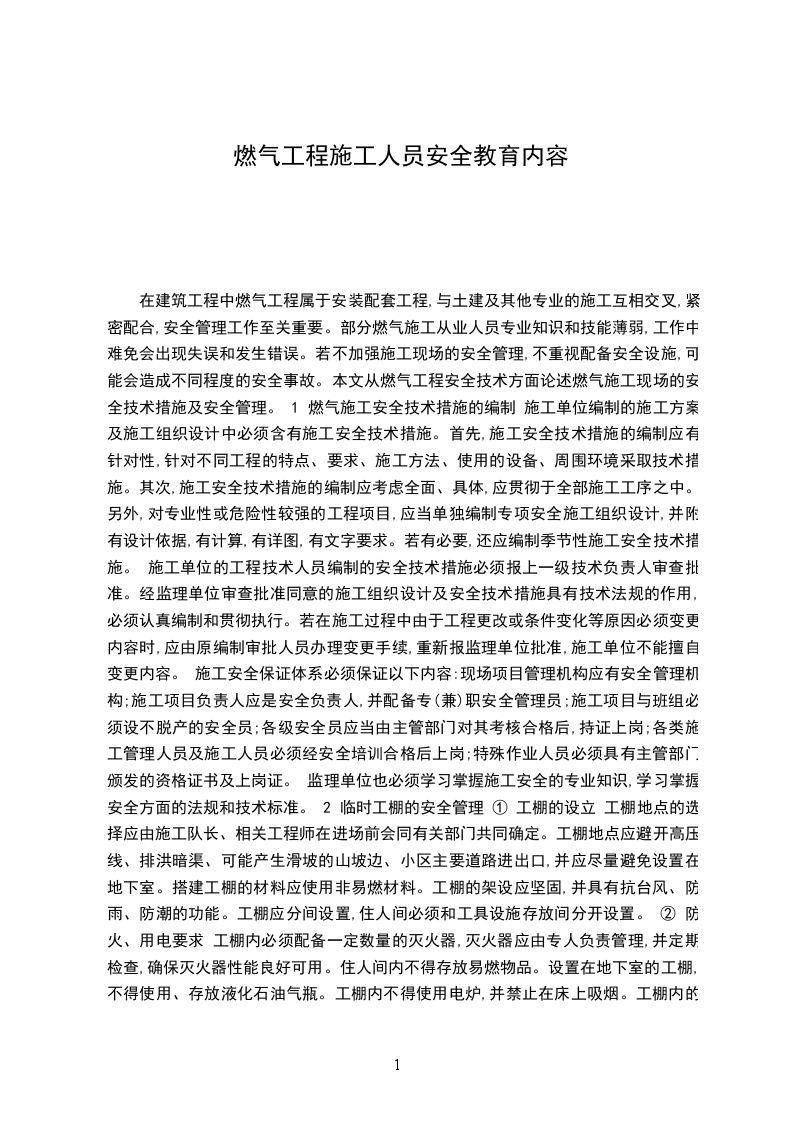在建筑工程中燃气工程属于安装配套工程,与土建及其他专业的施工互相交叉,紧密配合,安全管理工作至关重要。部分燃气施工从业人员专业知识和技能薄弱,工作中难免会出现失误和发生错误。若不加强施工现场的安全管理,不重视配备安全设施,可能会造成不同程度的安全事故。本文从燃气工程安全技术方面论述燃气施工现场的安全技术措施及安全管理。 1 燃气施工安全技术措施的编制 施工单位编制的施工方案及施工组织设计中必须含有施工安全技术措施。首先,施工安全技术措施的编制应有针对性,针对不同工程的特点、要求、施工方法、使用的设备、周围环境采取技术措施。其次,施工安全技术措施的编制应考虑全面、具体,应贯彻于全部施工工序之中。另外,对专业性或危险性较强的工程项目,应当单独编制专项安全施工组织设计,并附有设计依据,有计算,有详图,有文字要求。若有必要,还应编制季节性施工安全技术措施。 施工单位的工程技术人员编制的安全技术措施必须报上一级技术负责人审查批准。经监理单位审查批准同意的施工组织设计及安全技术措施具有技术法规的作用,必须认真编制和贯彻执行。若在施工过程中由于工程更改或条件变化等原因必须变更内容时,应由原编制审批人员办理变更手续,重新报监理单位批准,施工单位不能擅自变更内容。 施工安全保证体系必须保证以下内容:现场项目管理机构应有安全管理机构;施工项目负责人应是安全负责人,并配备专(兼)职安全管理员;施工项目与班组必须设不脱产的安全员;各级安全员应当由主管部门对其考核合格后,持证上岗;各类施工管理人员及施工人员必须经安全培训合格后上岗;特殊作业人员必须具有主管部门颁发的资格证书及上岗证。 监理单位也必须学习掌握施工安全的专业知识,学习掌握安全方面的法规和技术标准。 2 临时工棚的安全管理 ① 工棚的设立 工棚地点的选择应由施工队长、相关工程师在进场前会同有关部门共同确定。工棚地点应避开高压线、排洪暗渠、可能产生滑坡的山坡边、小区主要道路进出口,并应尽量避免设置在地下室。搭建工棚的材料应使用非易燃材料。工棚的架设应坚固,并具有抗台风、防雨、防潮的功能。工棚应分间设置,住人间必须和工具设施存放间分开设置。 ② 防火、用电要求 工棚内必须配备一定数量的灭火器,灭火器应由专人负责管理,并定期检查,确保灭火器性能良好可用。住人间内不得存放易燃物品。设置在地下室的工棚,不得使用、存放液化石油气瓶。工棚内不得使用电炉,并禁止在床上吸烟。工棚内的电线布置应由队内具有电工专业知识的人员负责布设,其他人员不得随意拉接电线。工棚用电原则上应装设控制箱,室内拉设的电线应敷设在套管内并固定,架空电缆应采取有效措施防止车辆等损坏,不得在电线上悬挂物品。指定专人负责用火、用电的安全监督。 __ ③ 材料存放 材料应分类堆放,乙炔、氧气瓶必须分开存放在不易碰撞的地方。防腐材料、聚四氟乙烯胶带、进口设备、施工机具等不得露天堆放;露天堆放的材料必须固定,并应有防水淹、防雨淋、防滑散、防盗窃措施。易燃物品如油漆等应做到随领随用,未用完的易燃易爆物品应放入密闭容器内,存在指定地点。 ④ 半成品的加工 施工中使用的半成品应在工棚附近的开阔场地加工。由于特殊原因必须在工棚内加工的,只能进行套丝、管件组装等冷加工。 ⑤ 工棚的检查 工棚中应设置必要的警示标志和施工涉及的管理制度,并明确工棚负责人和安全员。工棚内只能住本公司施工人员,并办理相应的手续。大型工棚应有专人值守,防止闲杂人员随意进入。负责值守的人员和负责用火用电安全的人员,应对工棚进行相应的检查,发现问题立即汇报。施工班组长应每天对工棚用火、用电、材料堆放、半成品的加工等进行全面检查,发现安全隐患及时上报。施工队长每周至少到工棚进行一次全面检查,确认符合要求,不留隐患。台风、暴雨来临前,施工队应组织检查工棚的防风、防洪情况,发现隐患及时采取措施,确保人身安全。在雷雨季节,施工单位应组织检查工棚的防雷及用电设备。 3 临时用电的安全管理 燃气施工临时用电具有开放性、暂时性、可变性、地域环境多样性等特点。其运行条件相对较差,安全性相对降低,极易由于电气故障而造成人员触电伤害和财产损失。为了提高施工用电的安全可靠性,必须结合施工现场实际和临时用电工程的特点,采取一些有针对性的措施:采用接地、接零保护系统;采用二级漏电保护系统;采用三级配电;规范配电线路的敷设;规范配电装置的电气配置和使用;规范电动建筑机械的安全装置和使用条件;规范电气照明设施;规范电工的专业性。4 高空、临边作业的安全管理 燃气立管敷设在外墙时,经常要进行攀登作业、悬空作业、临边作业、洞口作业及上下交叉作业。一些洞口、临边及外墙,虽然都设置了防护栏杆、安全网及脚手架,但是高空坠落事故时有发生。因此,对高空作业的安全技术措施必须特别留意以下有关事项:技术措施及所需材料机具要完整地列入施工计划;进行技术教育和现场技术交底;所有安全标志、工具和设备等,在施工前逐一检查;做好对高空作业人员的考核、持证和体检。在整个施工过程中为保证不出纰漏,不发
