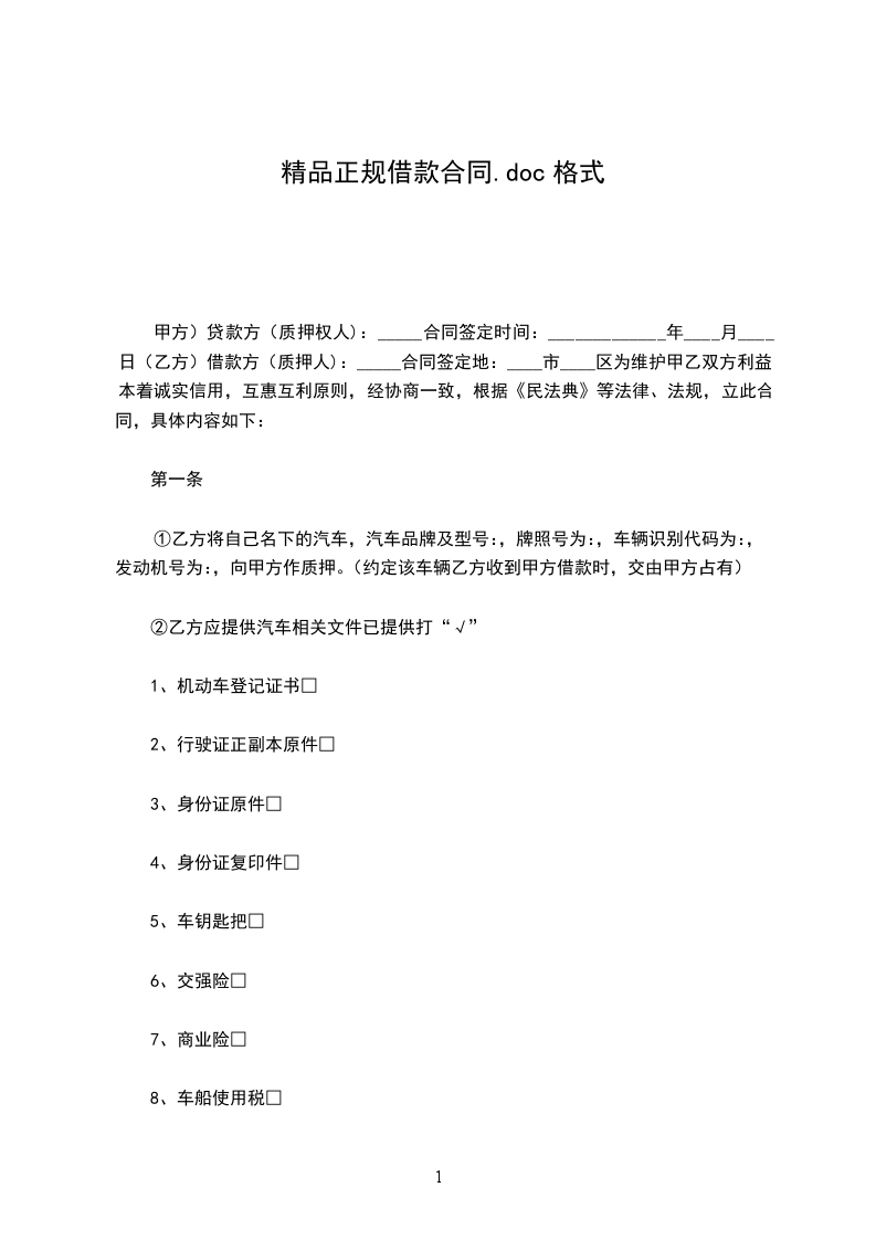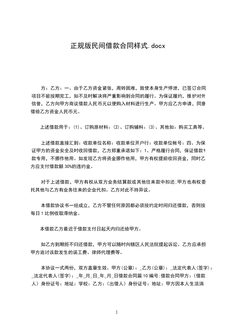 一、乙方向甲方借款金额(人民币) 元(大写: 仟 佰 拾 万 仟 佰 拾 元整)。