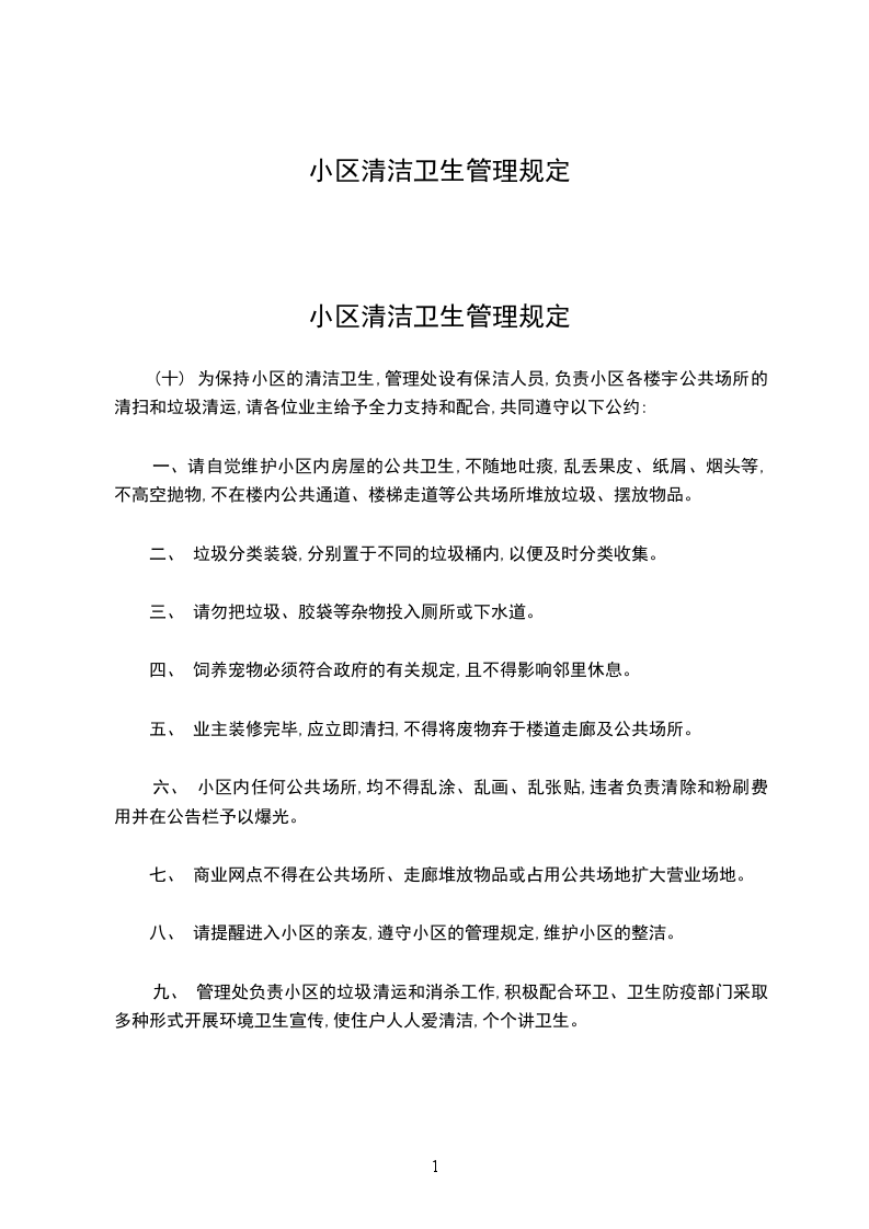 (十) 为保持小区的清洁卫生,管理处设有保洁人员,负责小区各楼宇公共场所的清扫和垃圾清运,请各位业主给予全力支持和配合,共同遵守以下公约: