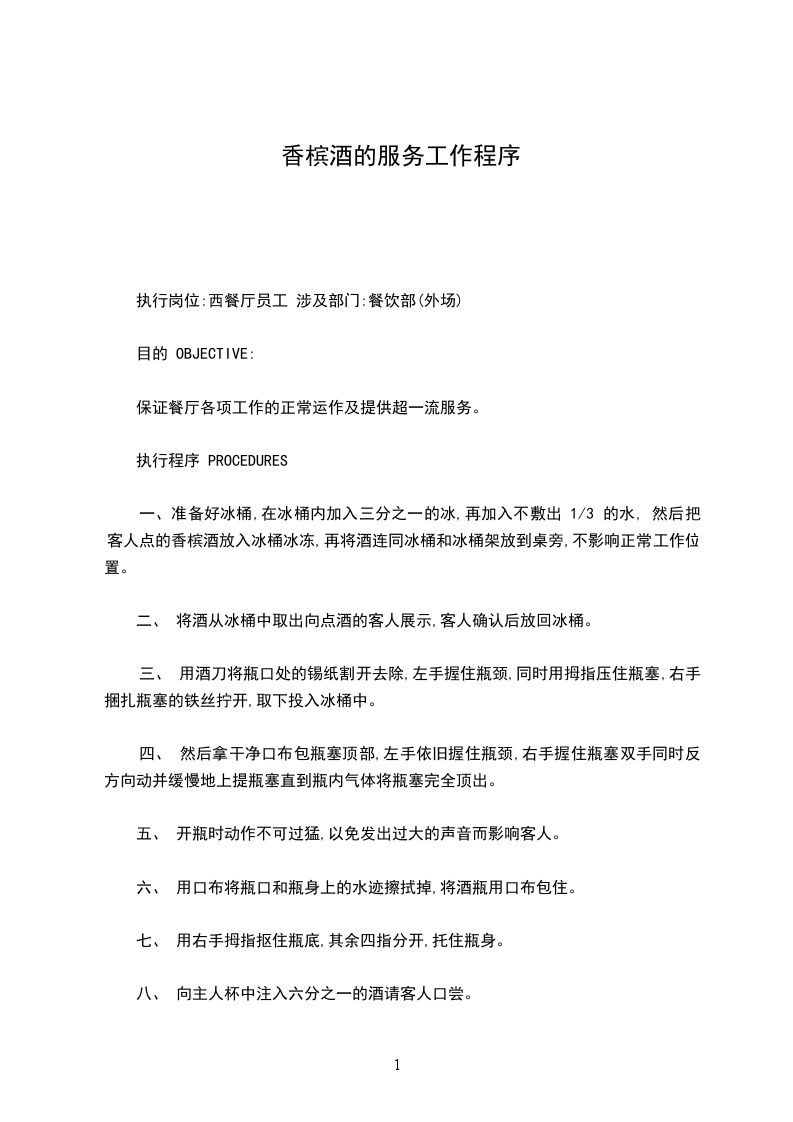 五、 开瓶时动作不可过猛,以免发出过大的声音而影响客人。