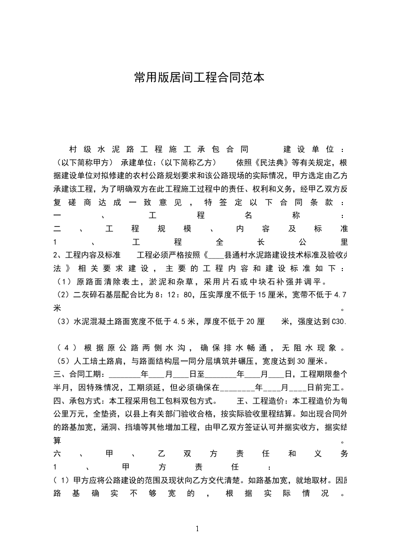 (以下简称甲方) 承建单位:(以下简称乙方) 依照《民法典》等有关规定,根据建设单位对拟修建的农村公路规划要求和该公路现场的实际情况,甲方选定由乙方承建该工程,为了明确双方在此工程施工过程中的责任、权利和义务,经甲乙双方反复磋商达成一致意见,特签定以下合同条款: