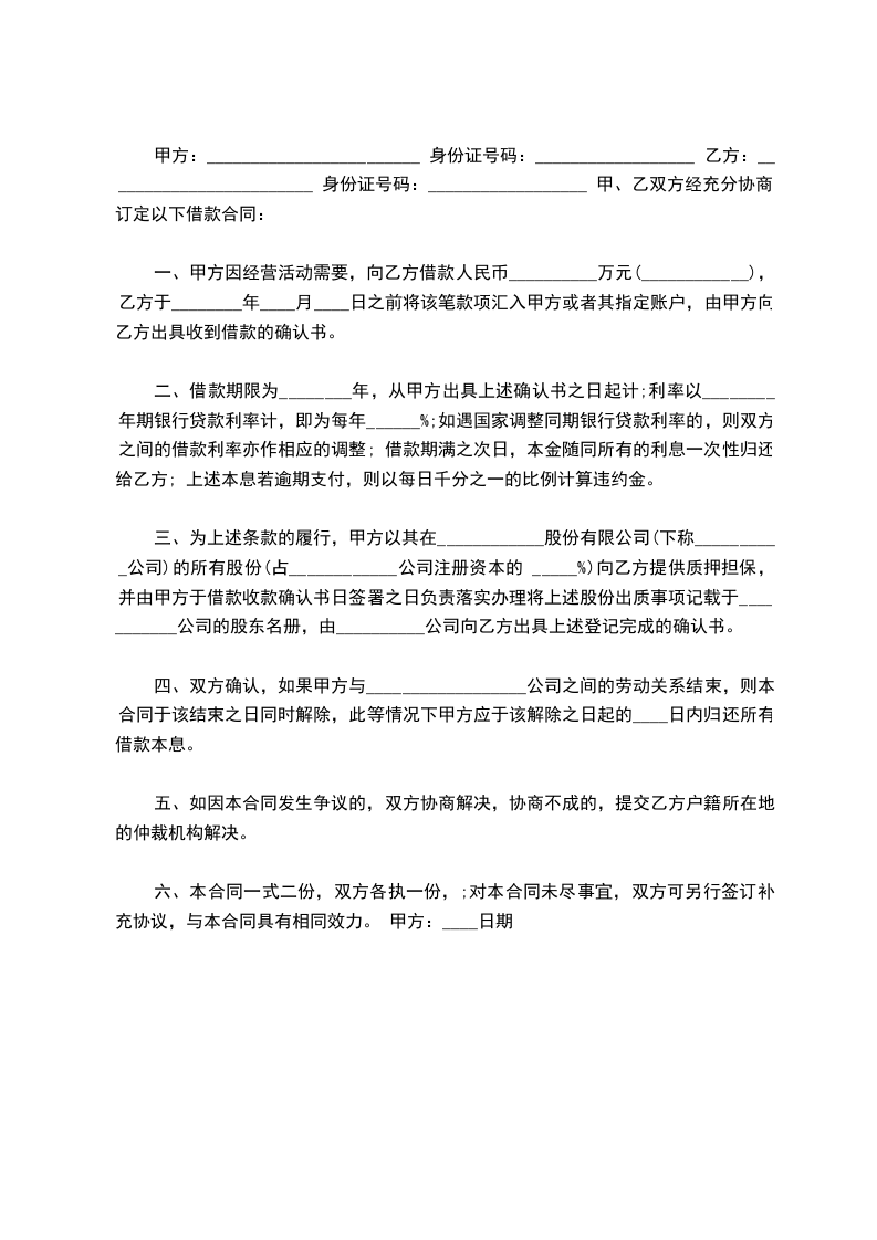 甲方:________________________ 身份证号码:__________________ 乙方:________________________ 身份证号码:__________________ 甲、乙双方经充分协商,订定以下借款合同: