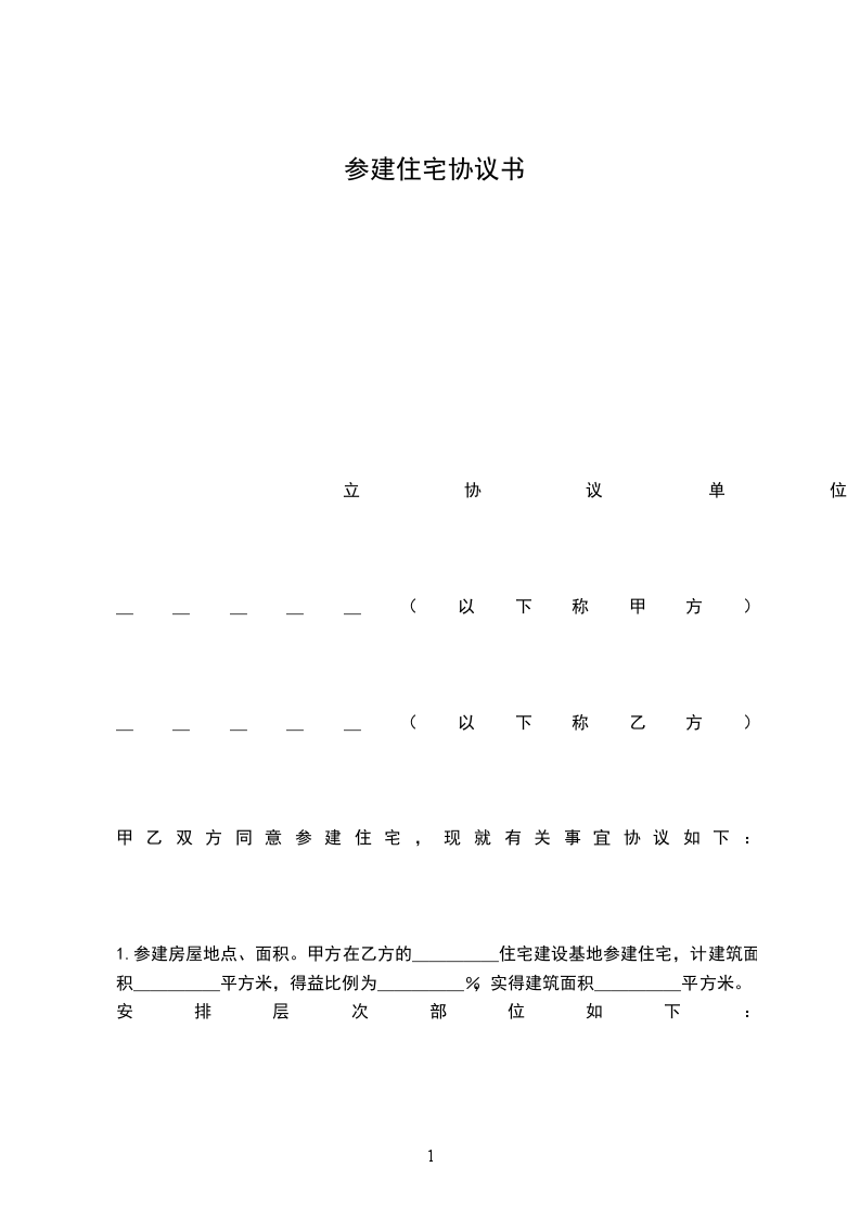 1.参建房屋地点、面积。甲方在乙方的_____住宅建设基地参建住宅,计建筑面积_____平方米,得益比例为_____%,实得建筑面积_____平方米。安排层次部位如下: