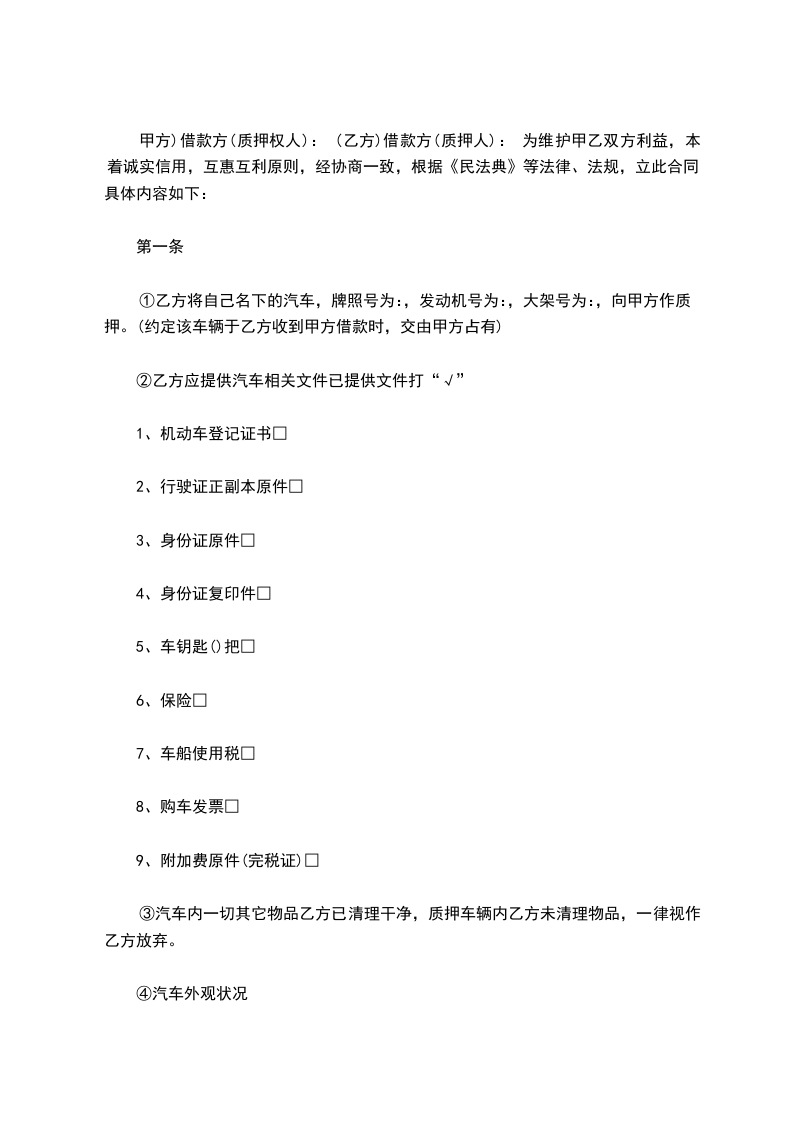 ①乙方将自己名下的汽车,牌照号为:,发动机号为:,大架号为:,向甲方作质押。(约定该车辆于乙方收到甲方借款时,交由甲方占有)