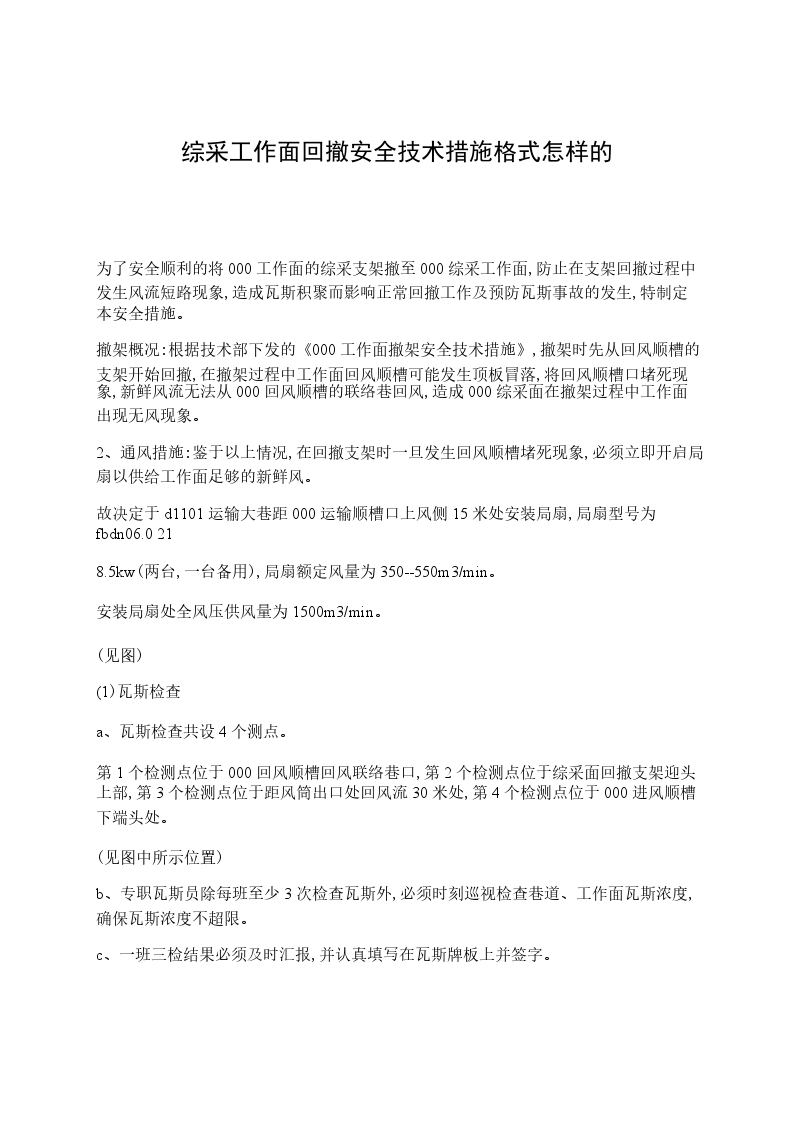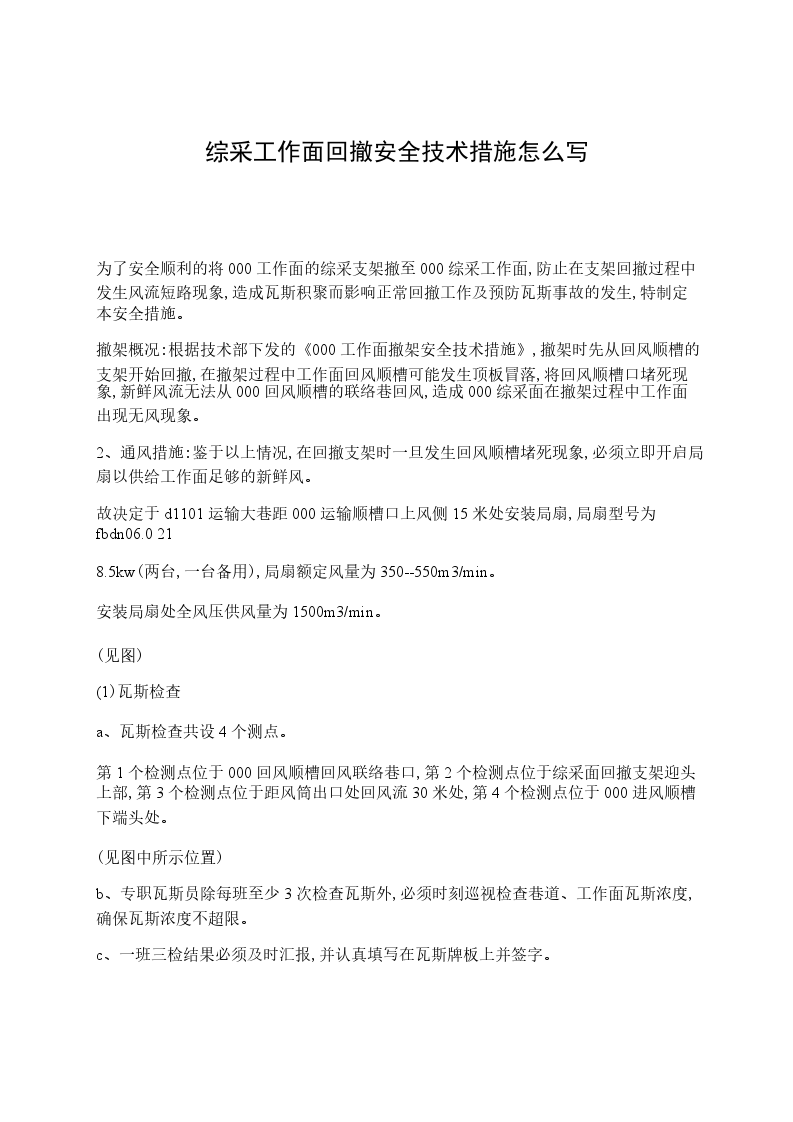 ①110101综采工作面回撤期间,安排专人检查有害气体情况,检查地点为工作面回撤作业点、运输顺槽回风流,每班检查次数不得少于3次,严禁瓦斯超限作业。
