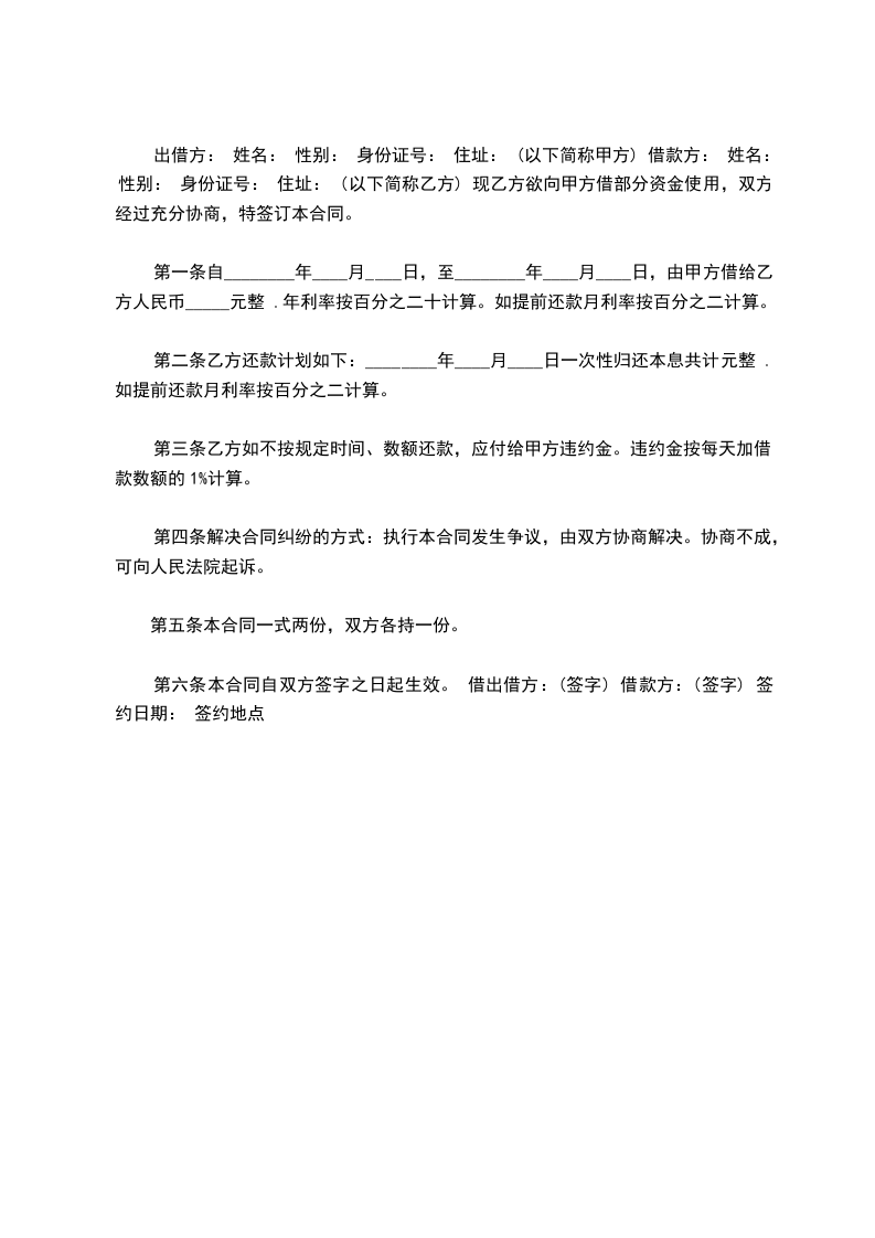 甲方(出借人)____________身份证号码:_______________ 乙方(借款人)____________身份证号码:__________________ 为了明确责任,恪守信用,在双方自愿、协商情况下特签订本合同以资共同信守。