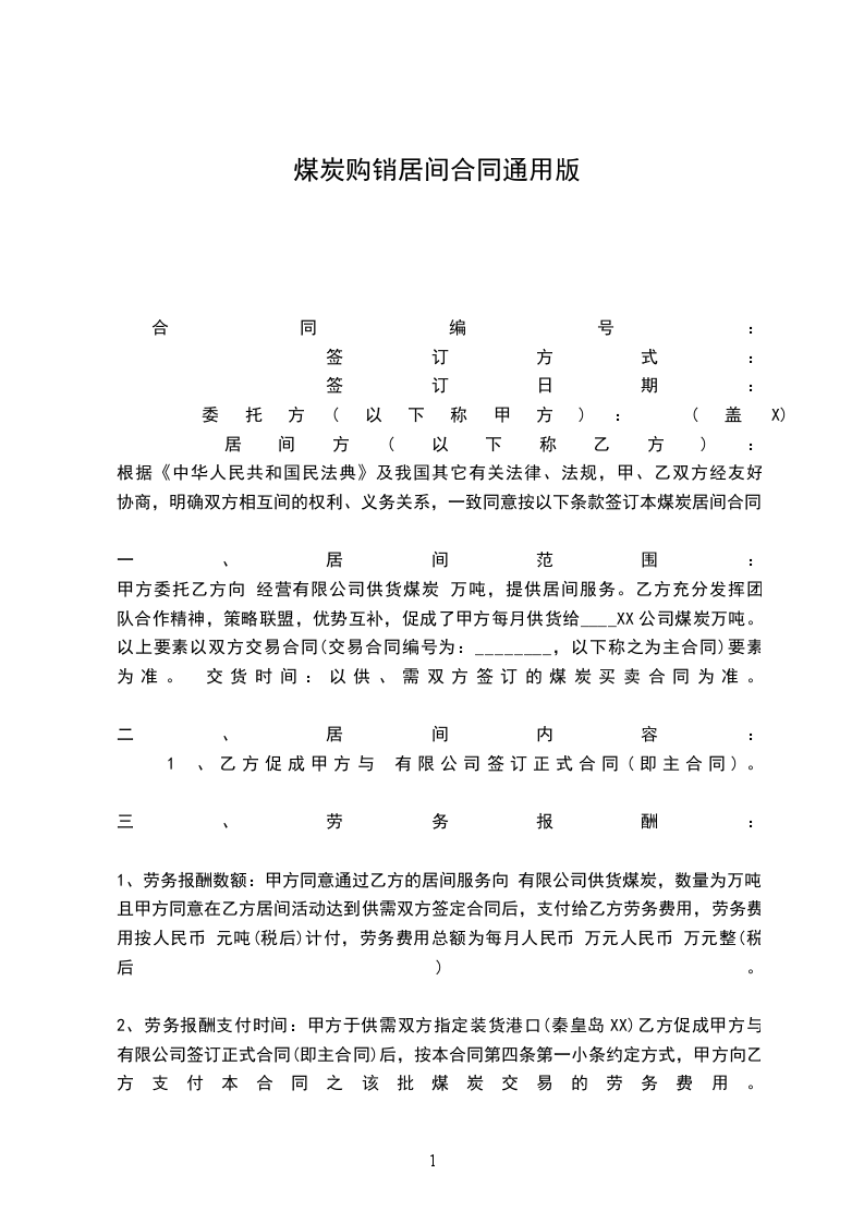 1、劳务报酬数额:甲方同意通过乙方的居间服务向 有限公司供货煤炭,数量为万吨,且甲方同意在乙方居间活动达到供需双方签定合同后,支付给乙方劳务费用,劳务费用按人民币 元吨(税后)计付,劳务费用总额为每月人民币 万元人民币 万元整(税后)。