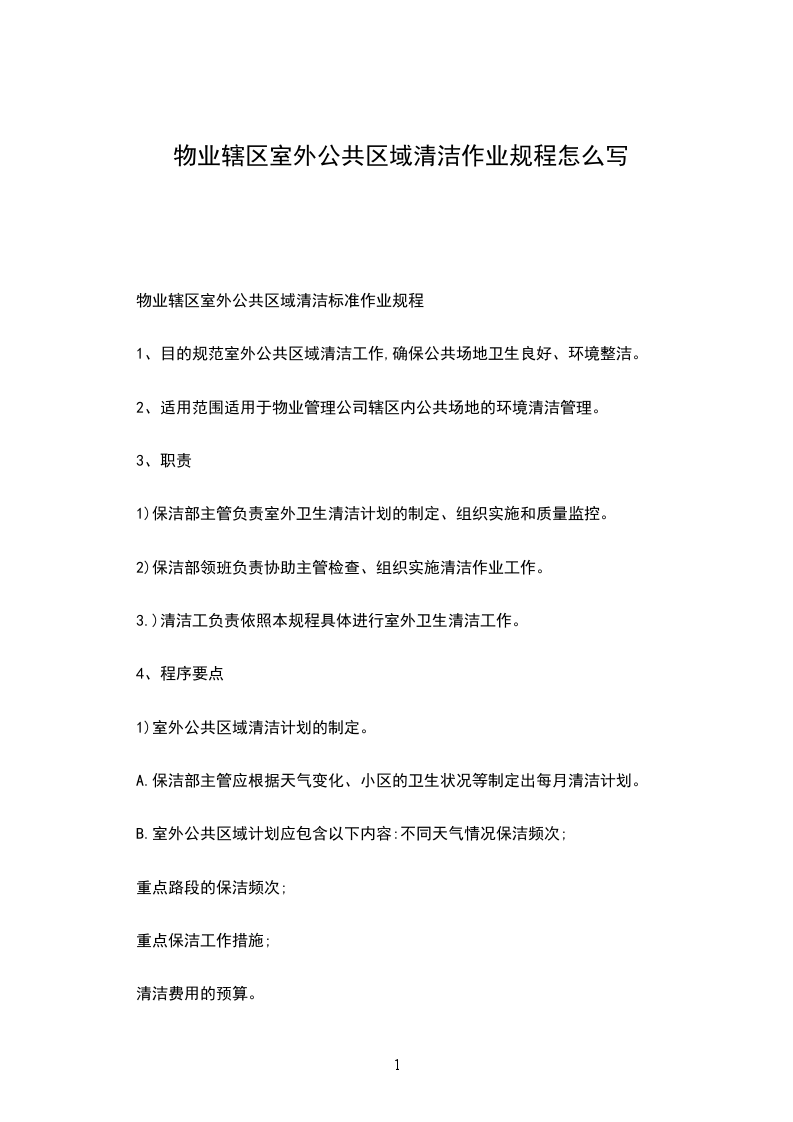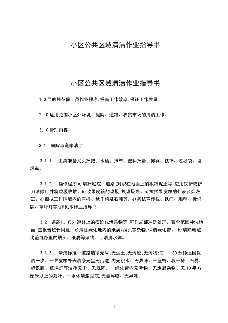1、目的规范室外公共区域清洁工作,确保公共场地卫生良好、环境整洁。